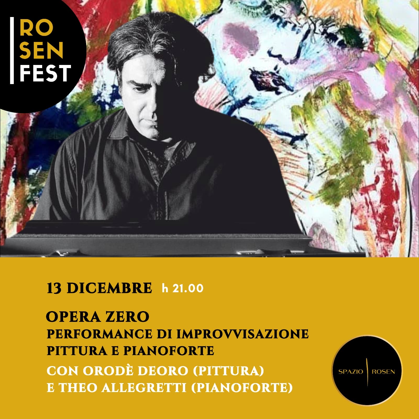 Sabato 13, alle 21, nella sala teatro, Spazio Rosen ospita “Opera Zero”, una performance di improvvisazione tra pittura e pianoforte con Orodè Deoro e il pianista e compositore Theo Allegretti. Opera Zero è l’incontro originario tra segno e suono. Theo Allegretti e Orodè Deoro creano in tempo reale un’unica materia viva, dove il pianoforte genera visioni e la pittura diventa musica. Una performance di nascita e metamorfosi, in cui gesto, segno e vibrazione coincidono nel momento stesso della creazione.
