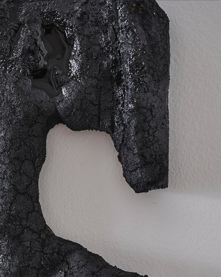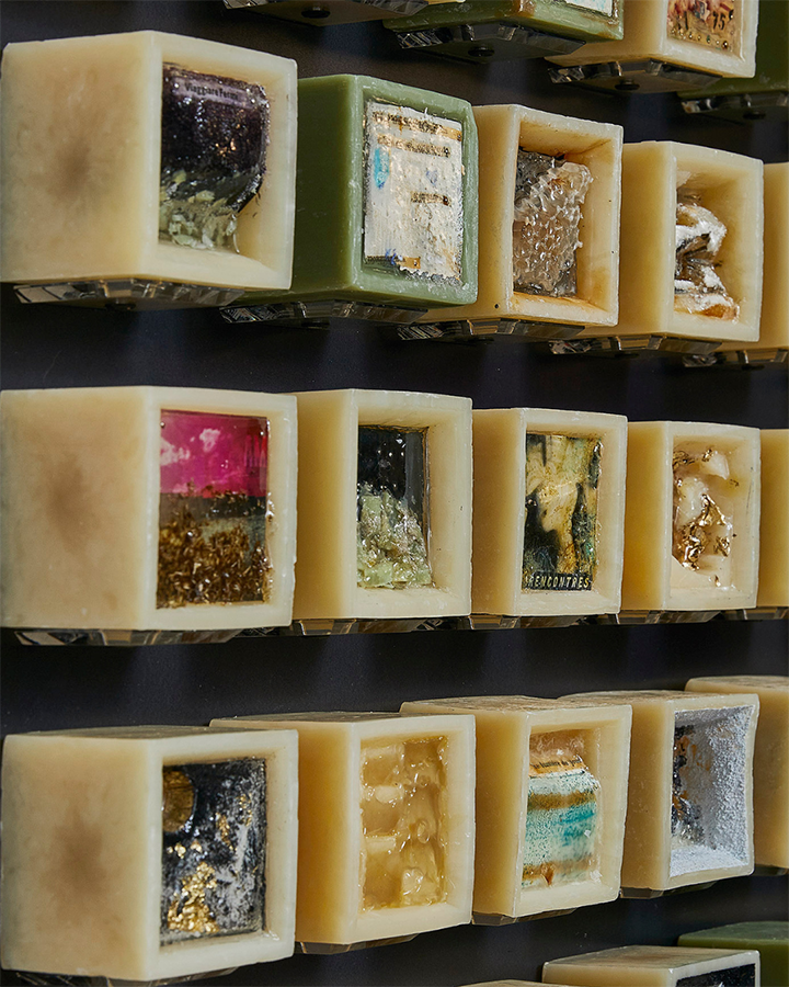 Il tempo, che siano i giorni trascorsi per completare un lavoro o il periodo vissuto in lockdown, diventa per l’artista una misura sulla quale basare la sua stessa opera: ventotto scatolette di sgombro per l’opera Come la ruggine, come i giorni del mese di febbraio per realizzarla; settanta cubi di sapone per Il rito di ogni giorno, come il numero delle giornate di chiusura totale in Italia nel momento della pandemia. Il tempo per Rossana Maggi si fa quindi portatore di materia, di un nuovo elemento col quale sperimentare, andare a fondo e tornare, in un ciclo di continuo mutamento. Lo stesso processo creativo dell’artista si basa sulla trasformazione dei diversi materiali e la loro manipolazione e combinazione per creare qualcosa d’altro, di unico e mai uguale a se stesso, un amalgama di tempo e materia. Ed è da questa che prende vita il percorso di creazione di opere che si fanno metafora di storie, idee e concetti: la ruggine è l’animo dell’accidioso che si lascia corrodere, la cenere è la morte degli operai durante la costruzione degli stadi per i mondiali del Qatar, il legno bruciato è il tempo trascorso che, inesorabile, ritorna.