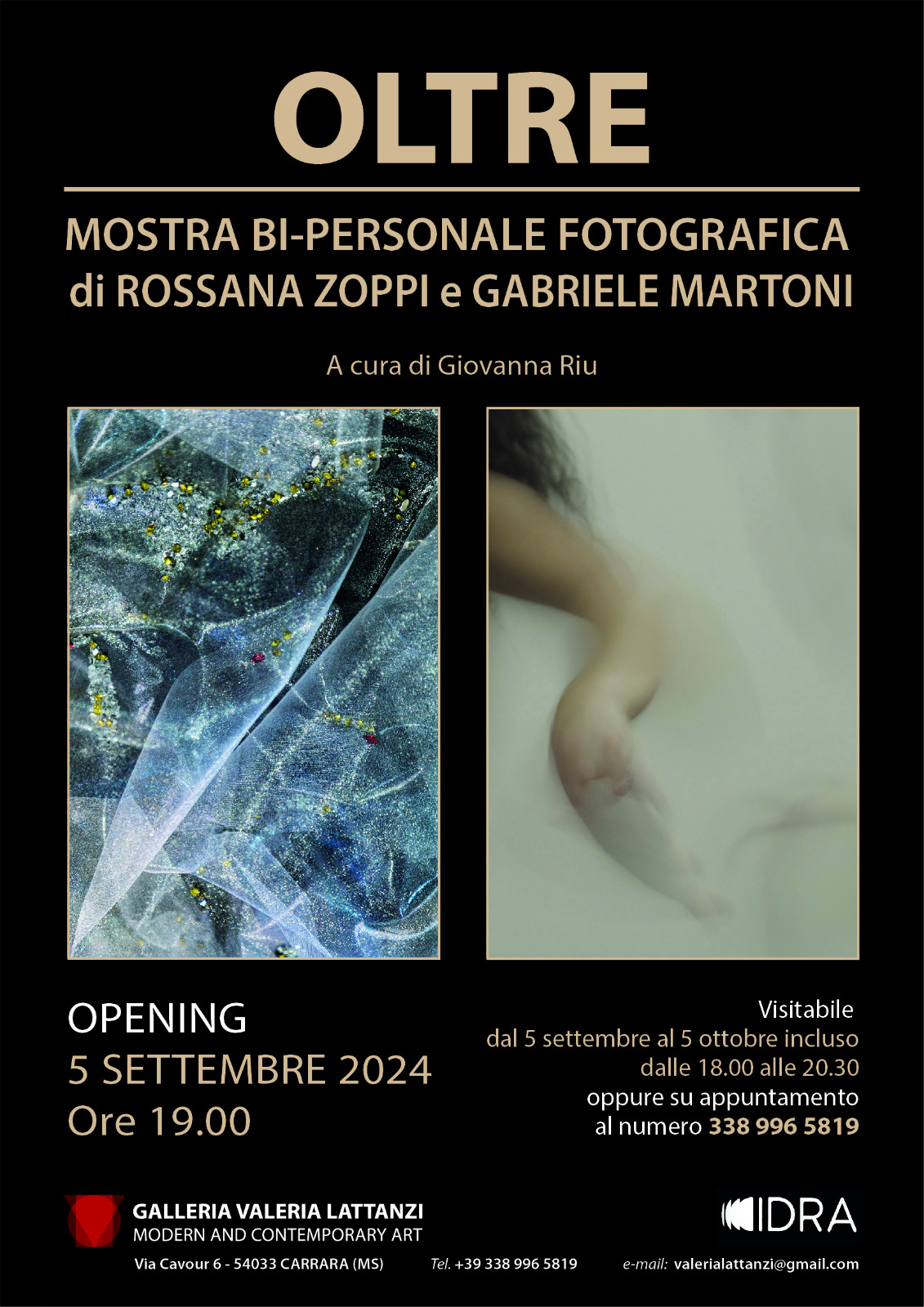 La Galleria Valeria Lattanzi è lieta di presentare la mostra fotografica bi-personale Oltre, la prima mostra degli artisti Rossana Zoppi e Gabriele Martoni nella sede della Galleria, curata per Rossana da Giovanna Riu e per Gabriele dalla gallerista. Entrando nelle sale espositive si viene a contatto con le opere fotografiche di Rossana in parte già esposte recentemente con grande successo alla Factory dell'artista Giuliano Tomaino a Sarzana e in precedenza a Villa Bottini a Lucca.