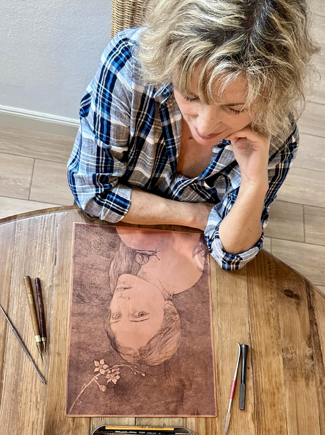 Una selezione di incisioni su carta EMP con ritocchi ad acquerello incentrate sulla rappresentazione del ritratto femminile ed in cui la delicatezza del tratto, gli inserimenti di elementi fitomorfici, uccelli ed insetti tramutano la donna in tramite in tramite privilegiato e prepotente di vita.