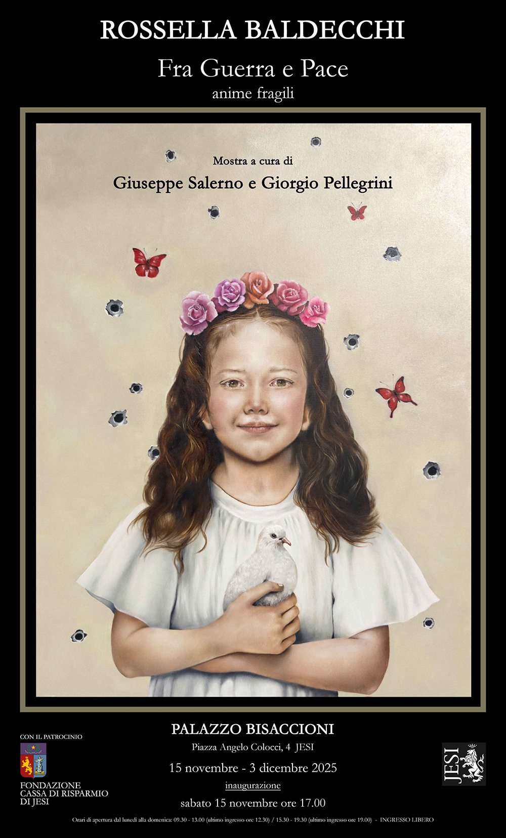 sabato 15 novembre alle ore 17:00 nelle sale Avorio all’interno di Palazzo Bisaccioni della Fondazione Cassa di Risparmio di Jesi in Via Colocci 4, si inaugura la personale di Rossella Baldecchi dal titolo “FRA GUERRA E PACE, fragili anime”.