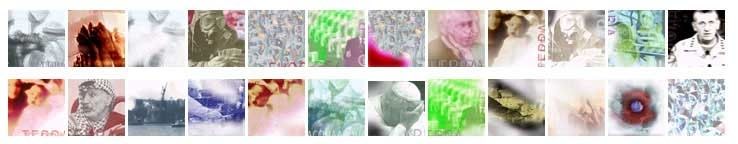 propagandistico e “pubblicitario”. Così accade che i soldati, con i loro elmetti tutti uguali, possano evocare, in una libera associazione, il tappeto di teschi del Ruanda. In altre il punto di vista dell’artista appare più legato all’emozione e alla ricerca di nuovi effetti e significati. Nascono così forme in cui l’elemento colore può essere una pennellata quanto una dissolvenza che rende tutto intuibile, o appena riconoscibile. A volte, dell’originale restano solo le linee di forza compositive. Altre volte, sono i simboli a prevalere; altre ancora l’artista ha colto assonanze con brani dell’arte del passato. Così la donna iraniana di Bam, riemersa dal buio della terra dopo il terremoto, ci appare come una visione di Goya, mentre il ragazzo palestinese aspirante kamikaze non può non far pensare ad un personaggio caravaggesco; i gruppi di immigrati, invece, ricordano brani di deposizioni in terracotta, o ancora, il naufragio della Medusa di Gericault. Questo sguardo fortemente partecipato, in cui si intuiscono empatia verso i sofferenti e indignazione nei confronti del potere, si prolunga nei testi, tratti da quotidiani e da libri, che scorrono, come commenti evocativi, lungo le immagini, creando un nesso inscindibile tra parola e figura.