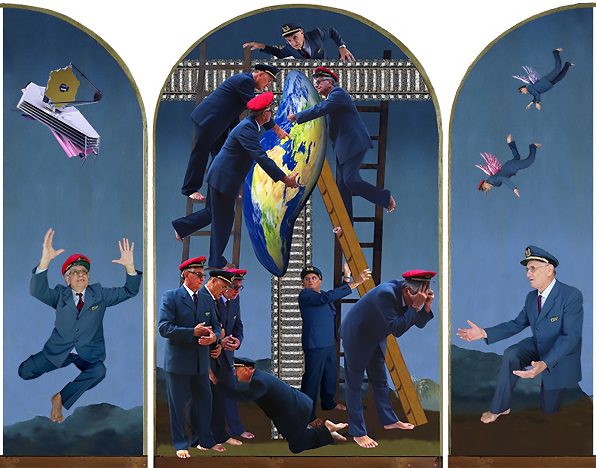 I Santini Del Prete presentano, nei locali dello Studio, Rosso come Blu un progetto che si compone di una azione performativa e di una serie di combinazioni a base fotografica in forma di pale d’altare, l’iconografia è quella della discesa dalla croce o deposizione. In forma di tableau vivant i due non-artisti realizzano attraverso una tecnica di giustapposizione, raddoppiamento, incastro della loro immagine una serie di discese dalla croce prese da Rosso Fiorentino (1495-1540). Sempre presenti in scena modificano di volta in volta il soggetto del martirio della Deposizione di Volterra (1521): li vediamo calare da una croce realizzata con due binari un vagone ferroviario, un operaio caduto da un’impalcatura, la terra ridotta a un cencio malconcio. In uno spazio mondano che si fa sacro veniamo posti di fronte ad una tragedia proposta con paradossale levità, con seria ironia, posti di fronte al nostro ruolo in una società traballante, sempre in bilico, fatta di deviazioni, a vivere in un ecosistema compromesso, guardare impotenti vite interrotte. Alle 11 e alle 18 una performance.