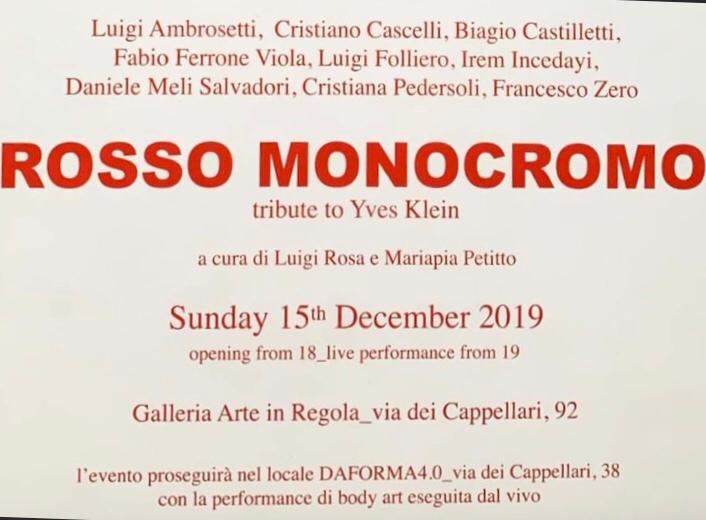 Domenica 15 dicembre alla Galleria Arte in Regola, nove artisti tra i più rappresentativi della scena romana - Luigi (LAC 68) Ambrosetti, Cristiano Cascelli, Biagio Castilletti, Luigi Folliero, Irem Incedayl, Cristiana Pedersoli, Daniele Meli Salvadori, Fabio Ferrone Viola e Francesco Zero – si riuniscono per omaggiare uno degli innovatori dell'arte contemporanea, Yves Klein, considerato l'iniziatore della body painting,
