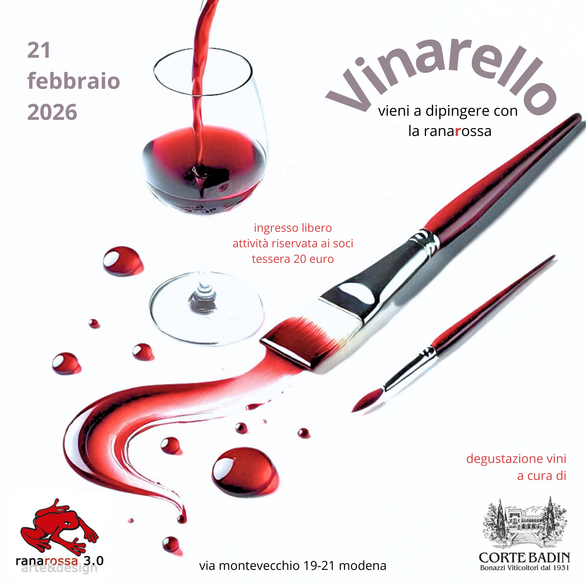 Nell’ambito della mostra, sabato 21 febbraio si terrà una degustazione di vini pregiati a cura della cantina della Valpolicella Corte Badin – Bonazzi Viticoltori dal 1931. Durante la serata, i visitatori potranno sperimentare la pittura con vino rosso, guidati dagli artisti della galleria, in un’esperienza partecipativa che unisce arte e convivialità