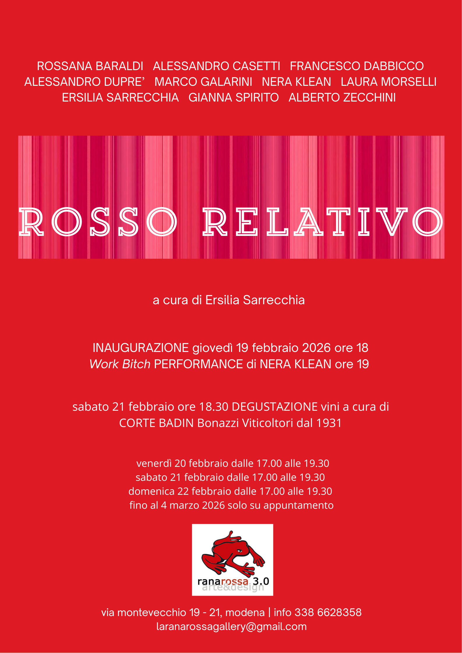 Attraverso il percorso espositivo ci addentriamo in un universo in cui il rosso si fa voce, presenza viva e pulsante nelle opere di Rossana Baraldi, Alessandro Casetti, Francesco Dabbicco, Alessandro Duprè, Marco Galarini, Nera Klean, Laura Morselli, Ersilia Sarrecchia, Gianna Spirito e Alberto Zecchini.
