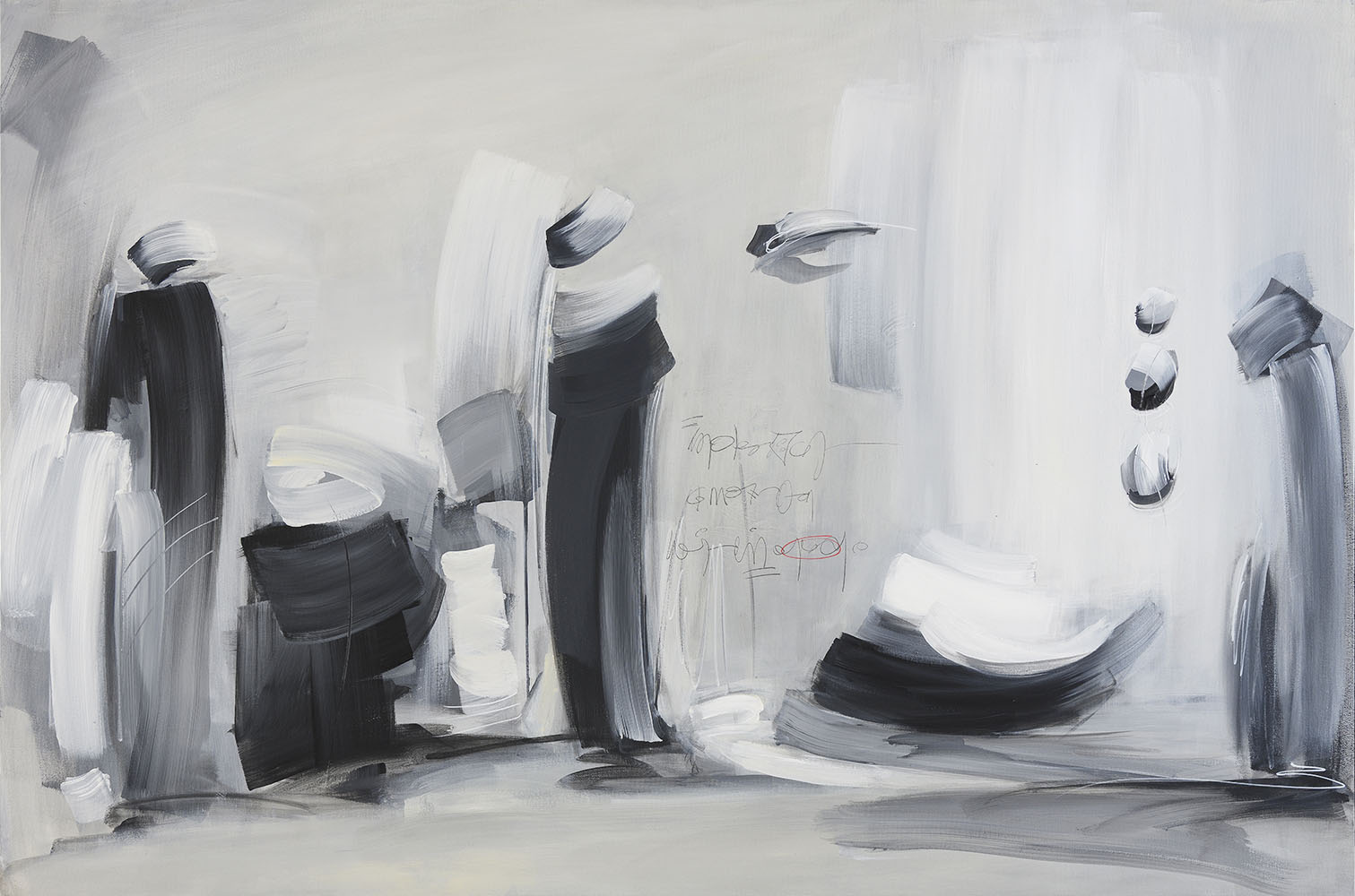 La scrittura e il segno sono elementi ricorrenti nella ricerca di Losito: una grafia compare con discrezione in alcuni pezzi come un mantra, una traccia, mnemonica e decorativa. Impronta e frammento di storia che attraversa lo spazio della pittura come eco di un linguaggio mai esistito.