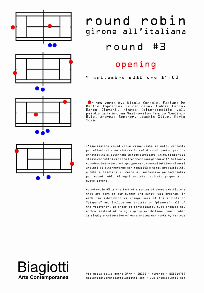 L’espressione “Round Robin” viene usata in molti contesti per riferirsi a un sistema in cui diversi partecipanti a un’attività si alternano in modo circolare.“Round Robin” è un lavoro di gruppo, ma non una collettiva: diversi artisti si alterneranno con modalità e tempi prestabiliti…