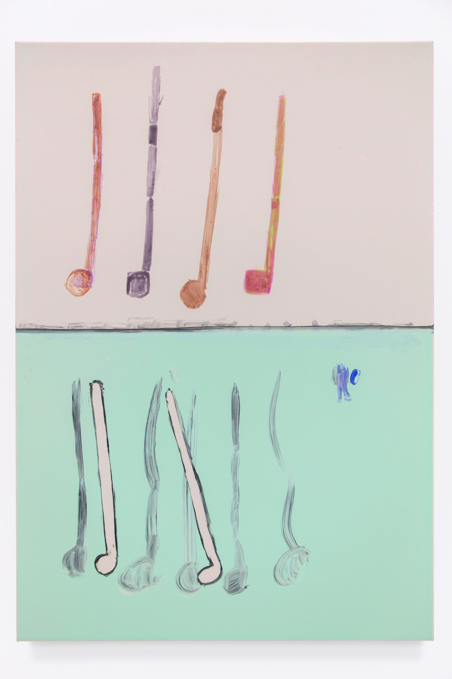 Spesso lavora simultaneamente a numerosi dipinti e sculture, causando una sovrapposizione di narrazioni e, a tratti, anche di forme e figure. Questa combinazione di scultura e pittura è molto evidente nell’opera “Untitled (Offerings)”, che consiste in dipinti di piccolo formato posizionati su di una mensola, anch’essa parte del lavoro, realizzati in resina Acrystal – un materiale che, data la sua elevata durezza superficiale, è ideale per produrre forme dettagliate e precise.