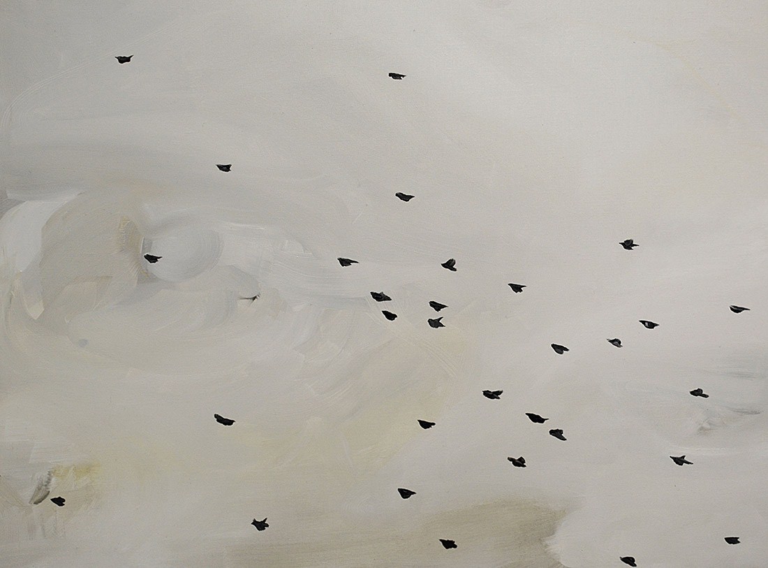 Le opere mostrano lo stadio iniziale dell’uomo, la forza e la tensione nel volersi opporre all’oscurità terrosa, all’amalgama sabbioso; l’idea dello scavo, del lavoro sotterraneo diventa tentativo di sopravvivenza, ma il foro di uscita, la sorgente da cui sollevarsi resta ancora labile ed effimera. Nel percorso di crescita si cerca allora una trasformazione, una possibilità che si traduce in spinta a costruire, a lasciare tracce di oggetti che ricordano un hangar, un carro armato, abbandonati in un paesaggio desertico e piatto. Allo stesso tempo, l’ascesa passa attraverso la ricostruzione di sé, ma quello che rimane è una testimonianza del volto umano ancora indefinito, modellato da una materia pastosa che raggiunge l’informe. Nel progetto dell’artista, questo tentativo di ricerca segna un momento centrale, un’evoluzione simbolica: la ricostruzione non è più qualcosa di fisico bensì diviene idea, spirito, immagine sacra. Le masse fangose lasciano il posto a tratti leggeri, costruiti per velature e l’astratta figura umana acquista verticalità, si delinea in uno sfondo di oscurità e si staglia eretta nella sua luce bianca fino ad esplodere nel bagliore dell’ultima sala, l’unica a pianta esagonale, la cima della torre, vicinissima allo spazio aperto del cielo. L’ambiente diventa qui il simbolo finale di tutto il percorso, l’atmosfera è rarefatta e la materia diviene aria, energia luminosa che palpita nella natura, nel volo che gli uccelli creano sulla tela, nel dinamismo del loro vortice. La figura umana si è così smaterializzata per trasformarsi in un’entità impalpabile, completamente assorbita e fusa nella perfezione della natura.