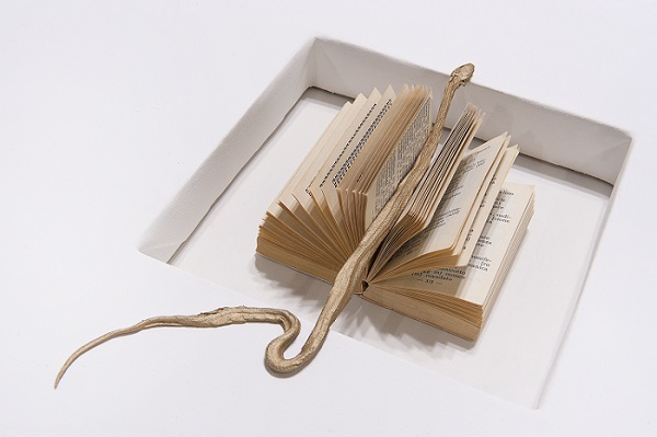 Maggi artista e Maggi grande promotore di cultura e di riflessione sulla contemporaneità, capace di sensibilizzare con chiarezza ma anche delicatezza di opere e azioni su questioni che toccano noi tutti. Così è anche per questa mostra pensata quasi come una Wunderkammer, una camera delle meraviglie, da percorrere con uno sguardo non superficiale ma curioso dei particolari intrinseci in ogni lavoro. Le meraviglie, le curiosità sono i libri, le pagine, gli innumerevoli oggetti che dialogano con le pagine a stampa, disegnate, negate, trasformate, sovrapposte, incollate, bucate con sapienza ed anche con una certa ironica leggerezza e casualità che le avvicina a oggetti di sapore surrealista. I ricordi di infanzia, suoi o della figlia, gli amori spinosi, i ricordi letterari, gli omaggi a grandi artisti, l’attenzione alla natura, ai particolari soprattutto della natura, tutto converge in un continuum che rende la mostra un unicum in cui procedere con stupore e attenzione.