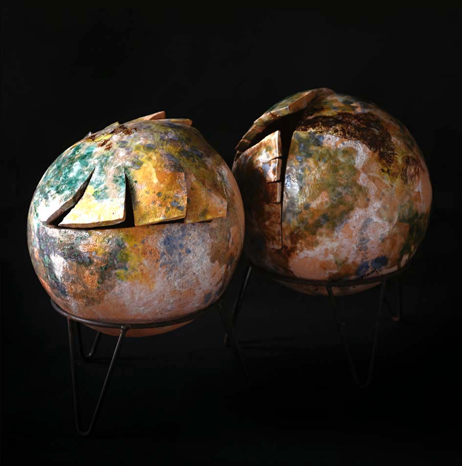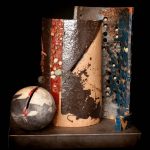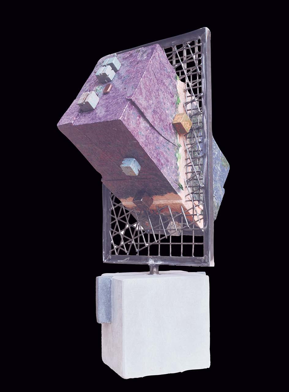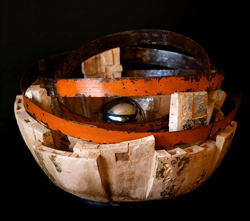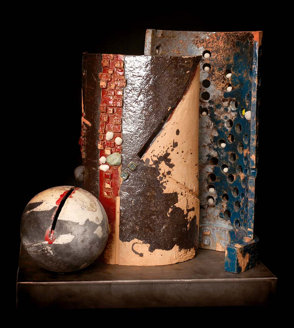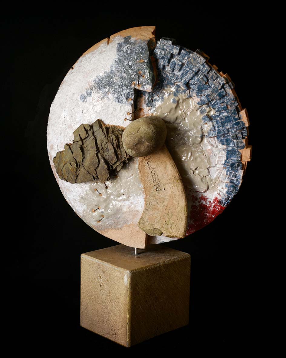 Il nostro Marrani, poco meno di dieci anni dal suo insediamento in Lombardia, opera una decisa virata nella sua attività artistica: passa dalla bidimensionalità della tela e della carta alla tridimensionalità della scultura, e comincia a lavorare con la creta e con la ceramica. I paesaggi umbri, e delle regioni dell’Italia centrale che aveva imparato a conoscere e che aveva raffigurato, con le antiche piante schematiche dei borghi abitati e gli appezzamenti dei terreni coltivati sulla superficie delle colline, e con le mappe delle strade che fendono i borghi abitati e gli agglomerati delle case che hanno dato vita ai quartieri, si sono come sollevati, mossi da una forza che dal ventre della terra li ha fatti emergere, assumendo un rilievo plasticamente tattile. Persiste e s’accentua, nella scultura di Marrani, quella che diventò un tempo nota come “veduta a volo d’uccello” – che in lingua inglese viene resa più propriamente con bird’s-eye view: ciò che l’uccello vede mentre è in volo. Le prime sculture dell’artista, da lui non casualmente denominate “aerosculture”, quasi a volerne non recidere il legame con l’“aeropittura” del suo maestro Dottori, sono case in miniatura, minuscoli parallelepipedi che sporgono dalla superficie di una terra lacerata, con le vie infossate che paiono i canaloni dei moderni film di fantascienza. Spesso l’artista ha accostato al titolo generico di “aeroscultura” l’espressione “analisi del territorio”, quasi a volerne suggerire l’intento di osservazione minuziosa; inoltre, Marrani è appassionato di archeologia e ha a lungo studiato le planimetrie delle antiche città, cogliendone i vari schemi di configurazione urbana. Occorre pure ricordare che l’artista aveva respirato la cultura degli antichi centri di produzione ceramica dell’Umbria (citiamo almeno Deruta, Gualdo Tadino, Gubbio e Orvieto) e che avrebbe ritrovato quella pratica, artigianale e artistica, nella terra in cui s’era insediato, in primis a Laveno e a Cunardo. Marrani si dota di un piccolo forno in cui cuocere le sue opere, padroneggia i viraggi dei colori prodotti dall’esposizione al calore e negli ultimi anni realizza anche raku, utilizzando giornali e segatura. Le dimensioni ridotte del forno gli impongono, quando crea sculture di un certo rilievo, di ricorrere ad assemblaggi di pezzi singoli, ricomposti sulla base dei progetti originari che ovviamente, in fase di realizzazione, subiscono modificazioni e registrano l’irruzione di spunti legati ai linguaggi propri dei materiali, che prendono la parola e guidano la visione dell’artista.