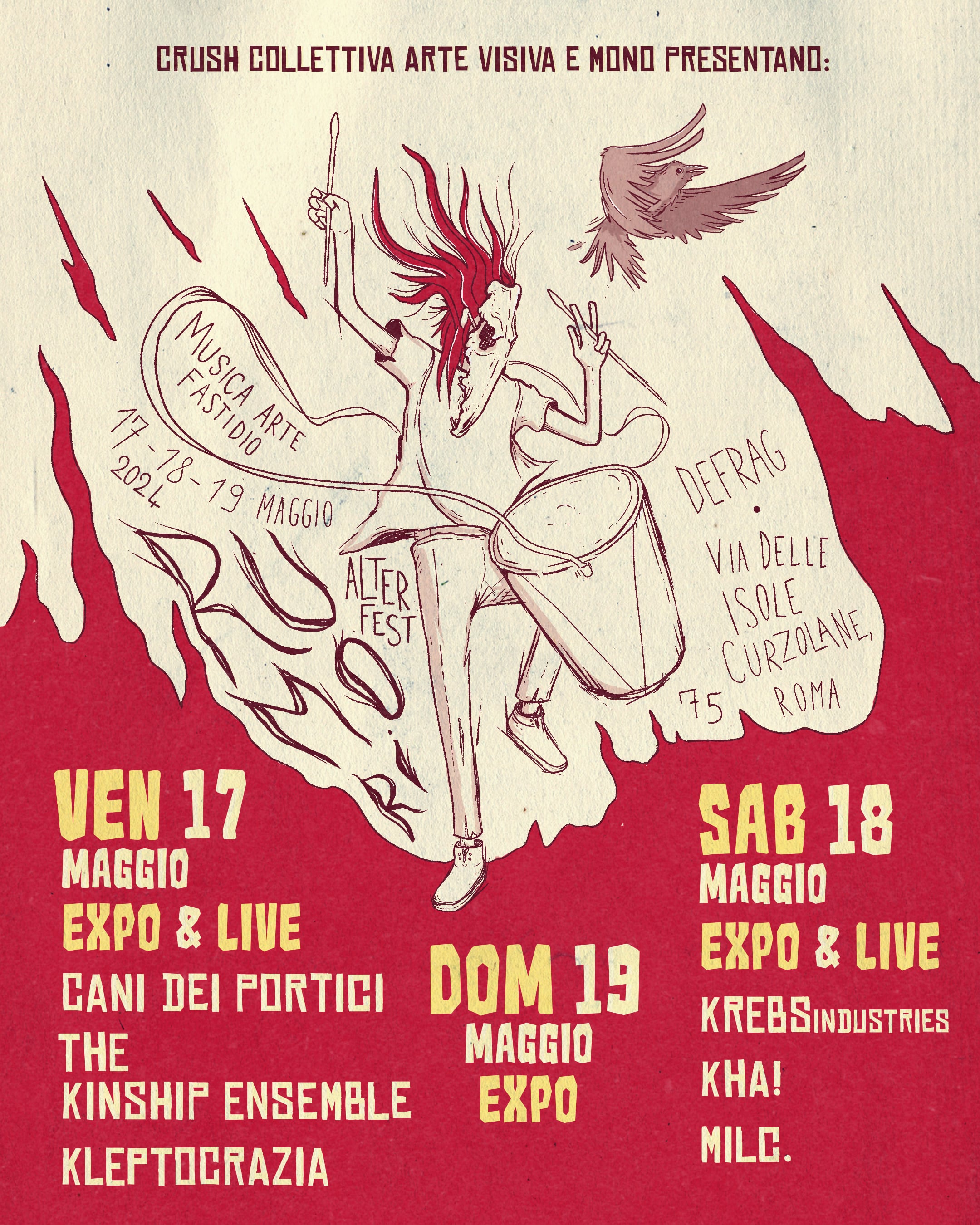 CRUSH - Collettiva Arte Visiva e MoNo (Movimento Noise), in collaborazione con l’associazione culturale Defrag, presenta 'Rumori – Alter Fest', evento dedicato al rumore come campo di riflessione e discussione tra mondo musicale, artistico, sociale e culturale. Il concetto di rumore raccoglie in sé, infatti, un insieme di sfumature che partono da una dimensione acustica non intenzionale, scaturita dal caso e soggetta all’imprevedibilità, per poi muoversi attraverso una selvaggia domesticazione a uso e consumo di chi intende ‘fare rumore’ e riappropriarsi del rumore attraverso un’agentività ludica, fastidiosa in modo costruttivo e collettivo, a volte perfino dagli intenti rivoluzionari.