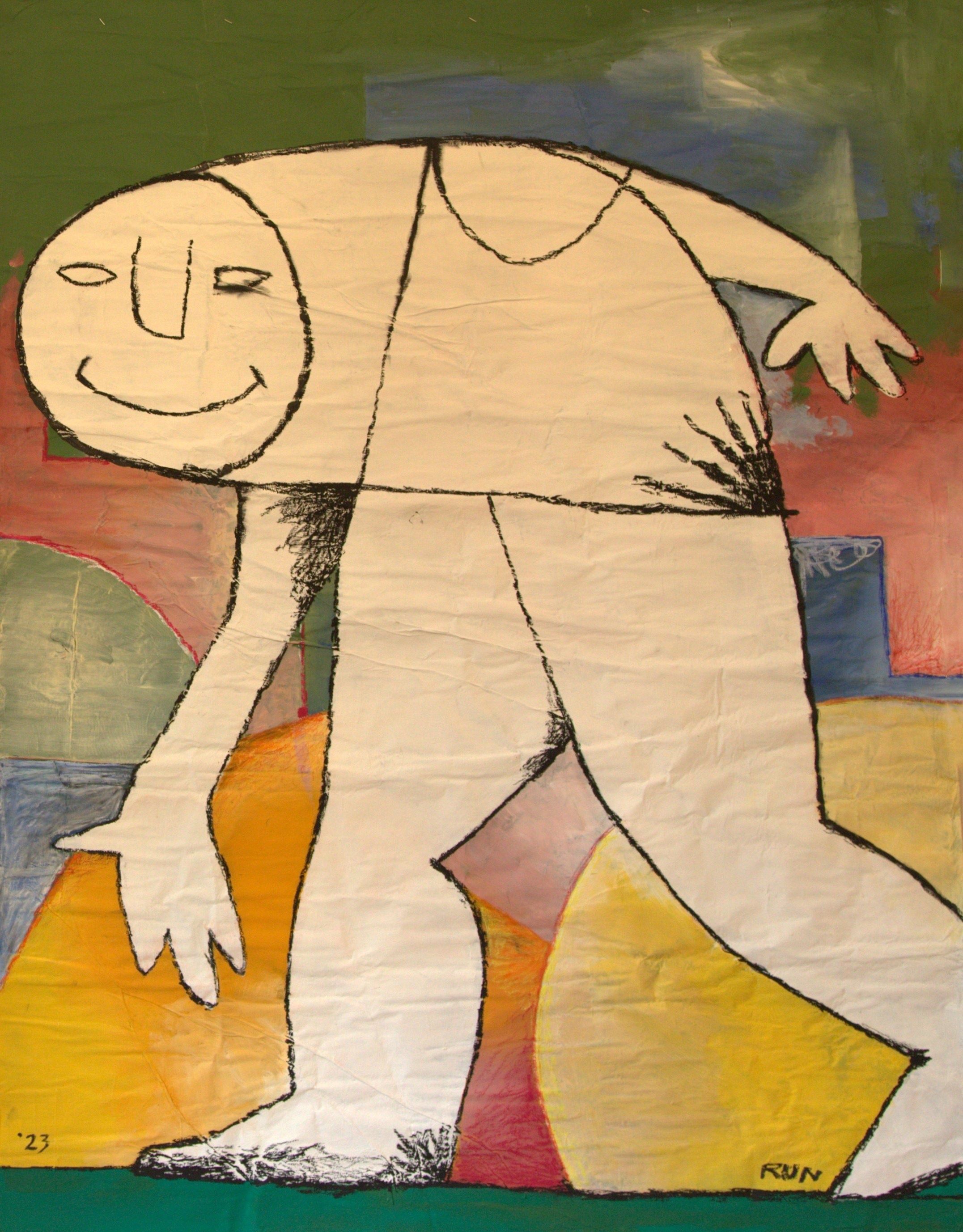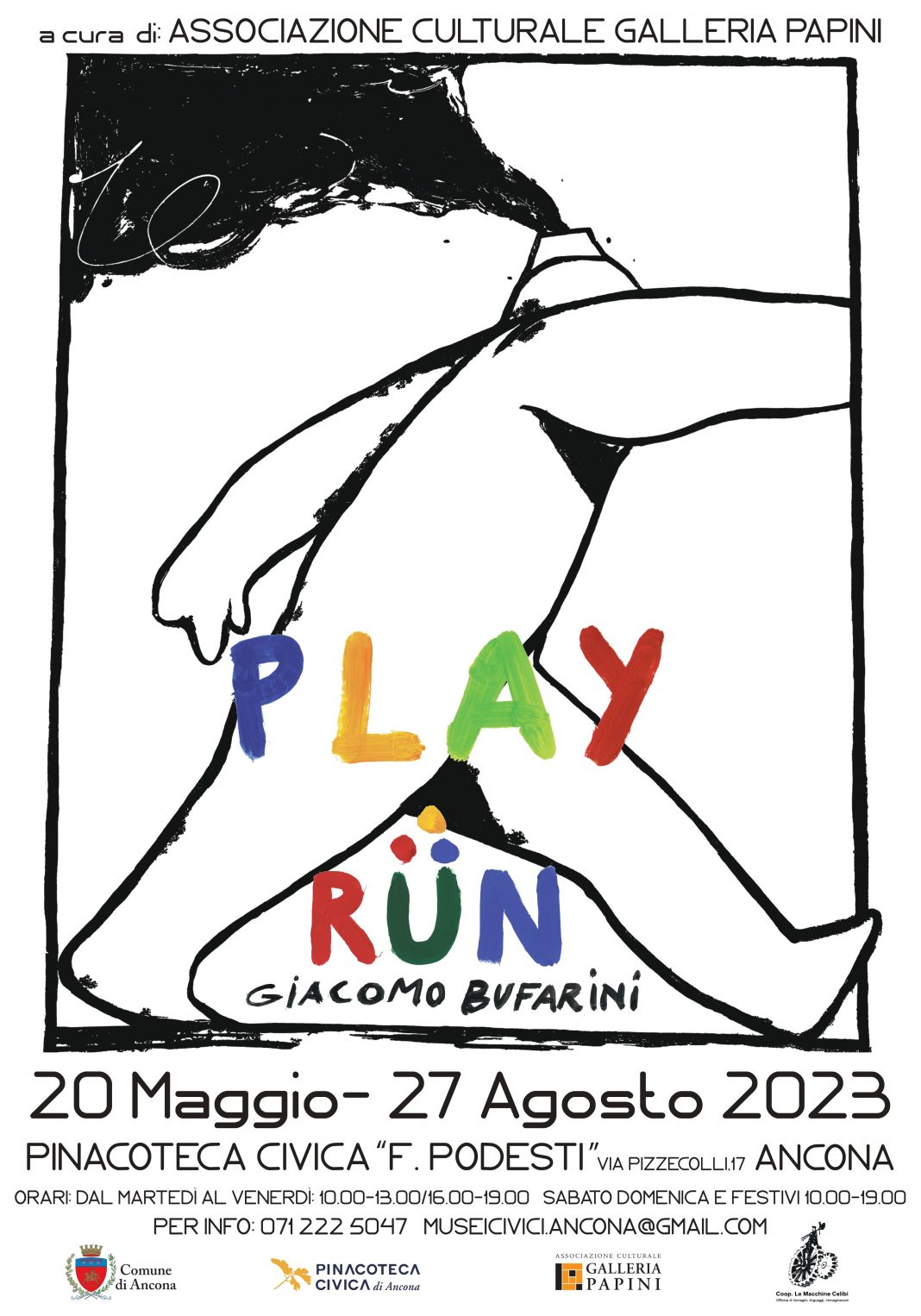 (...) Nel progetto “Play”, organizzato negli spazi della Pinacoteca Civica di Ancona, le opere d’artedi Run entrano con rispetto ma anche con la grande vitalità e l'effusiva forza espressiva che le contraddistinguono, riuscendo a creareuna continuità senza precedenti fra passato e presente. È a questo punto che l’artista decide di assumere il ruolo di narratore per raccontare quella che è la sua arte ed il suo modo di vedere il mondo; per farlo, sceglie di dare voce al suo “bambino interiore”, ovvero a quella parte spirituale legata in modo indissolubile al mondo dell’infanzia e del gioco e che, troppo spesso, vive celata e nascosta nella parte più profonda di ciascuno di noi. Nell’interiorità di Run questa voce è invece forte e dirompente, espressione della sua istintività e, proprio per questo, vero motore creativo della sua poetica; attraverso le tonalità colorate della sua voce interiore, l’artista accompagna lo spettatore nel suo personalissimo universo multiforme, nel quale vivono e convivono sfingi antropomorfee misteriosefigure primigenie che sembrano riemergere da un mare preistorico senza tempo. (...)