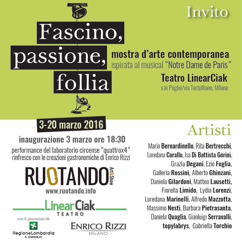 L’arte visiva approda in posti inconsueti e incontra pubblici nuovi con la prima tappa del progetto Ruotando Art&Show che nel giorno del suo debutto ufficiale, giovedì 3 marzo, metterà in mostra, nella galleria del foyer al Teatro LinearCiak di Milano, una serie di opere contemporanee liberamente ispirate al musical “Notre Dame de Paris” (in scena dal 3 al 26 marzo).