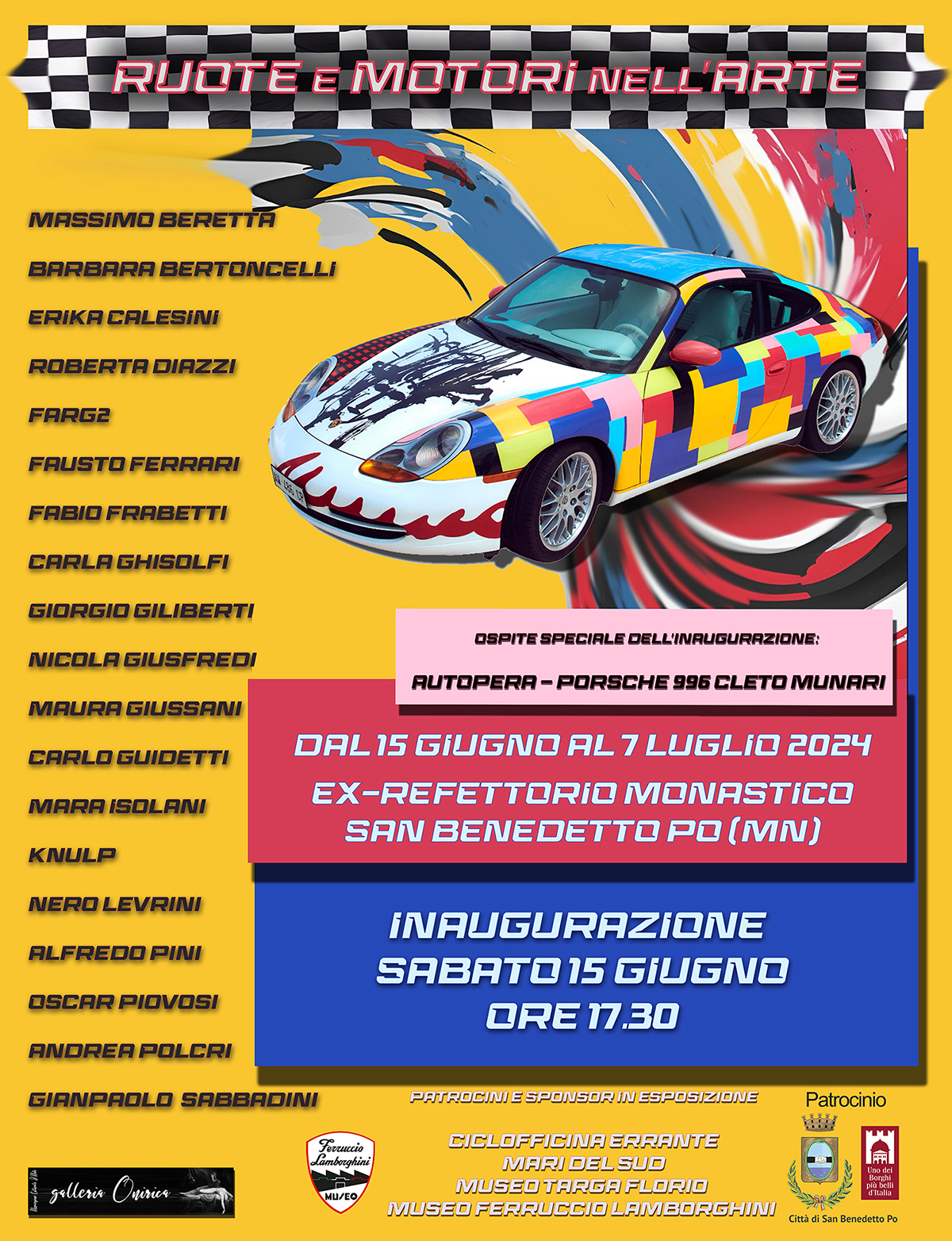 L’AutOpera - Porsche 996 Cleto Munari, sabato 15 giugno farà bella mostra di sé nel mantovano a San Benedetto Po, in piazza Matilde di Canossa davanti all’ex Refettorio Monastico dell’Abbazia del Polirone, sede dell’affresco del Correggio. Grazie all’avvocato Cristian Henrich Stove che la condurrà come ospite speciale dell’inaugurazione alla grande mostra Ruote e motori nell’arte. Storia dell’arte, avanguardia, design e contemporaneità si intrecciano ampliando all’ennesima potenza la grandezza della creatività umana. AutOpera è stata realizzata da 5 grandi nomi a livello mondiale della Transavanguardia che l’hanno firmata con i loro più celebri tratti stilistici: Alessandro Mendini, Ettore Sottsass, Mimmo Paladino, César Pelli e Cleto Munari l’ideatore. I protagonisti della mostra di pittura, scultura, fotografia e installazioni che inaugura alle ore 17.30 sono: Massimo Beretta, Barbara Bertoncelli, Erika Calesini, Roberta Diazzi, Farg2, Fausto Ferrari, Fabio Frabetti, Carla Ghisolfi, Giorgio Giliberti, Nicola Giusfredi, Maura Giussani, Carlo Guidetti, Mara Isolani, Knulp, Nero Levrini, Alfredo Pini, Oscar Piovosi, Andrea Polcri, Gianpaolo Sabbadini. Sponsor in esposizione: Mari del Sud e Ciclofficina Errante. Con il patrocinio e la storia di Nuccio Salemi fondatore del Museo Targa Florio, Museo Ferruccio Lamborghini. Saranno presenti il sindaco di San Benedetto Po “Uno dei Borghi più Belli d’Italia” Roberto Lasagna, l’assessore alla Cultura, Turismo e Politiche giovanili Vanessa Morandi e parte del settore Cultura e Musei. Il catalogo della mostra sarà disponibile in sede. Pare che per amicizia e passione, anche il grande Cleto Munari farà visita a Ruote e motori nell’arte nel weekend d’inaugurazione! La mostra terminerà il 7 luglio. Per informazioni cell. 328 8662152.