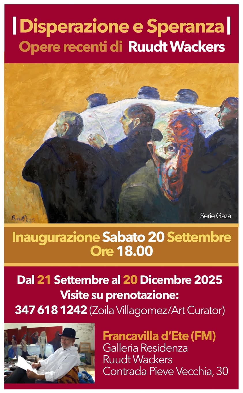 Sotto gli Auspici del Comune di Francavilla D’Ete (FM) , della Pro Loco e Centro Culturale di Francavilla D’Ete (FM), organizzata dalla Art Manager ecuadoriana Zoila Villagomez, si inaugura il 20 settembre alle ore 18.00, una mostra di opere recenti di Ruudt Wackers. In esposizione anche opere pittoriche ispirate dai tragici eventi di Gaza, da qui il titolo della mostra “Disperazione e Speranza”. L’esposizione sarà allestita a Francavilla D’Ete (FM) nella Galleria Residenza Ruudt Wackers in via Pieve Vecchia, 30. E’ visitabile su prenotazione dal 21 Settembre a 20 Dicembre 2025.