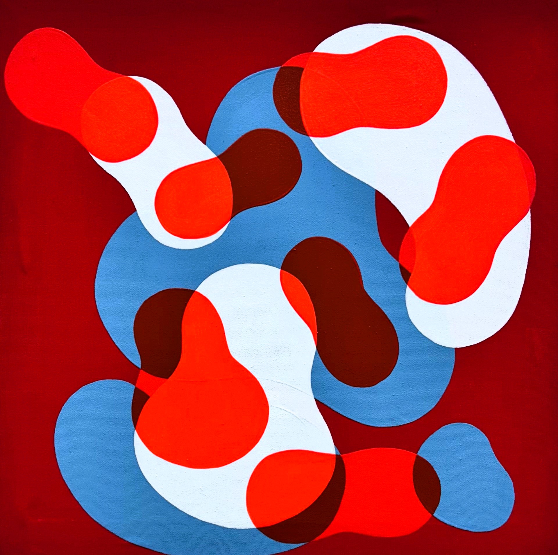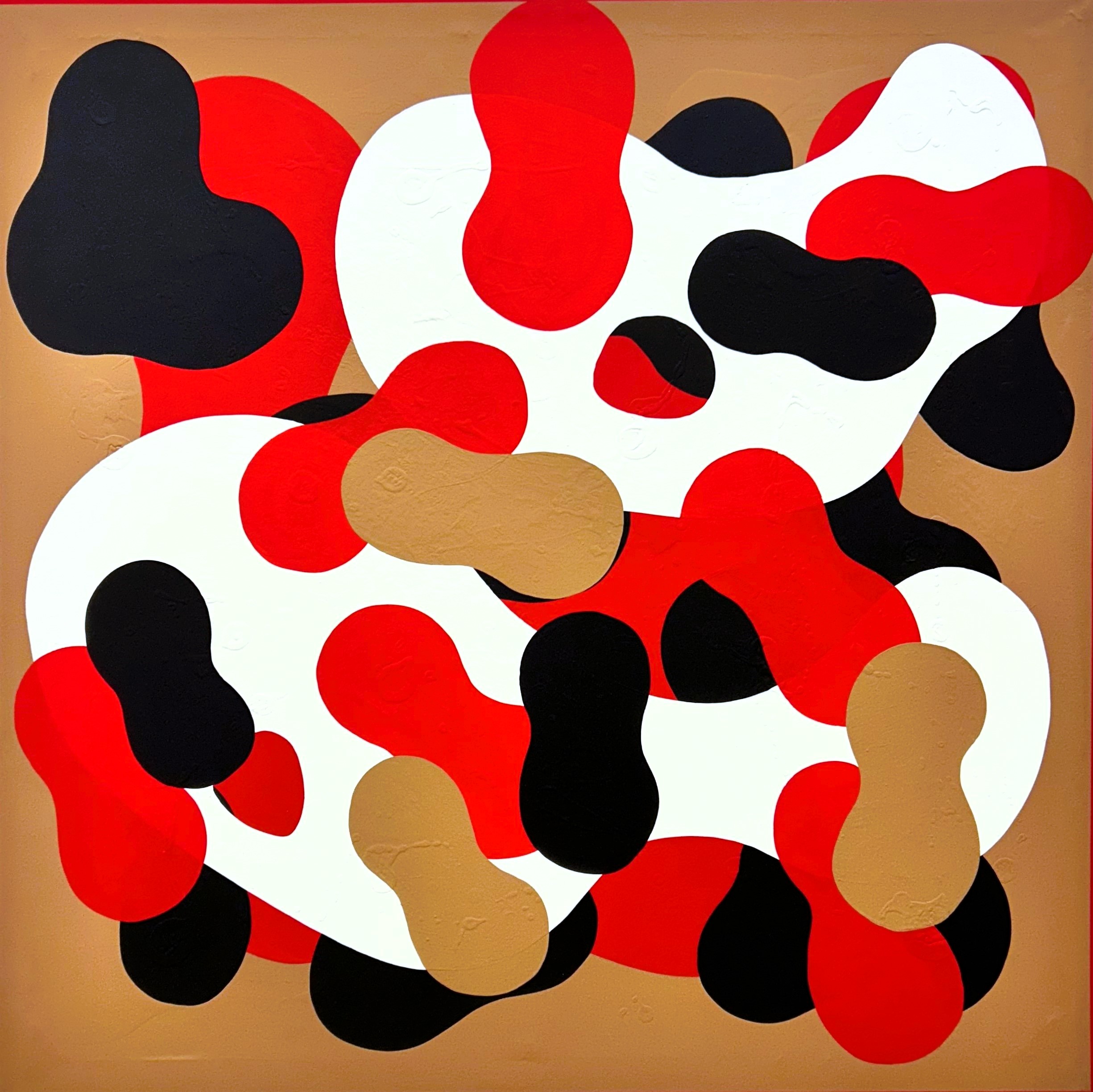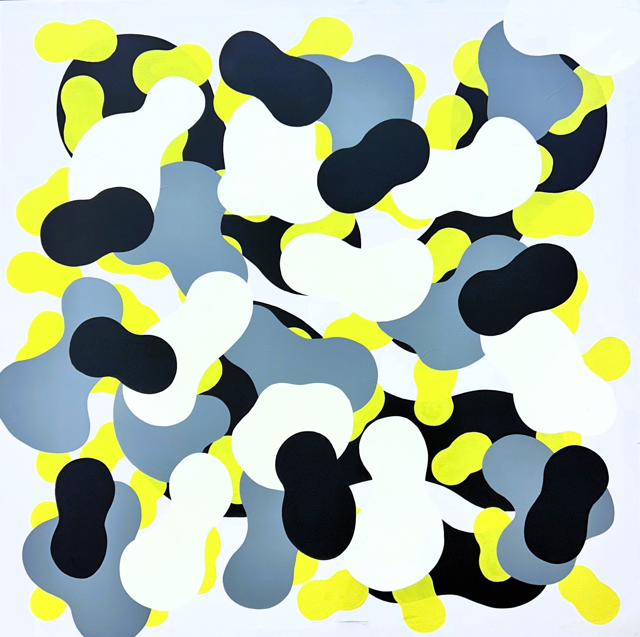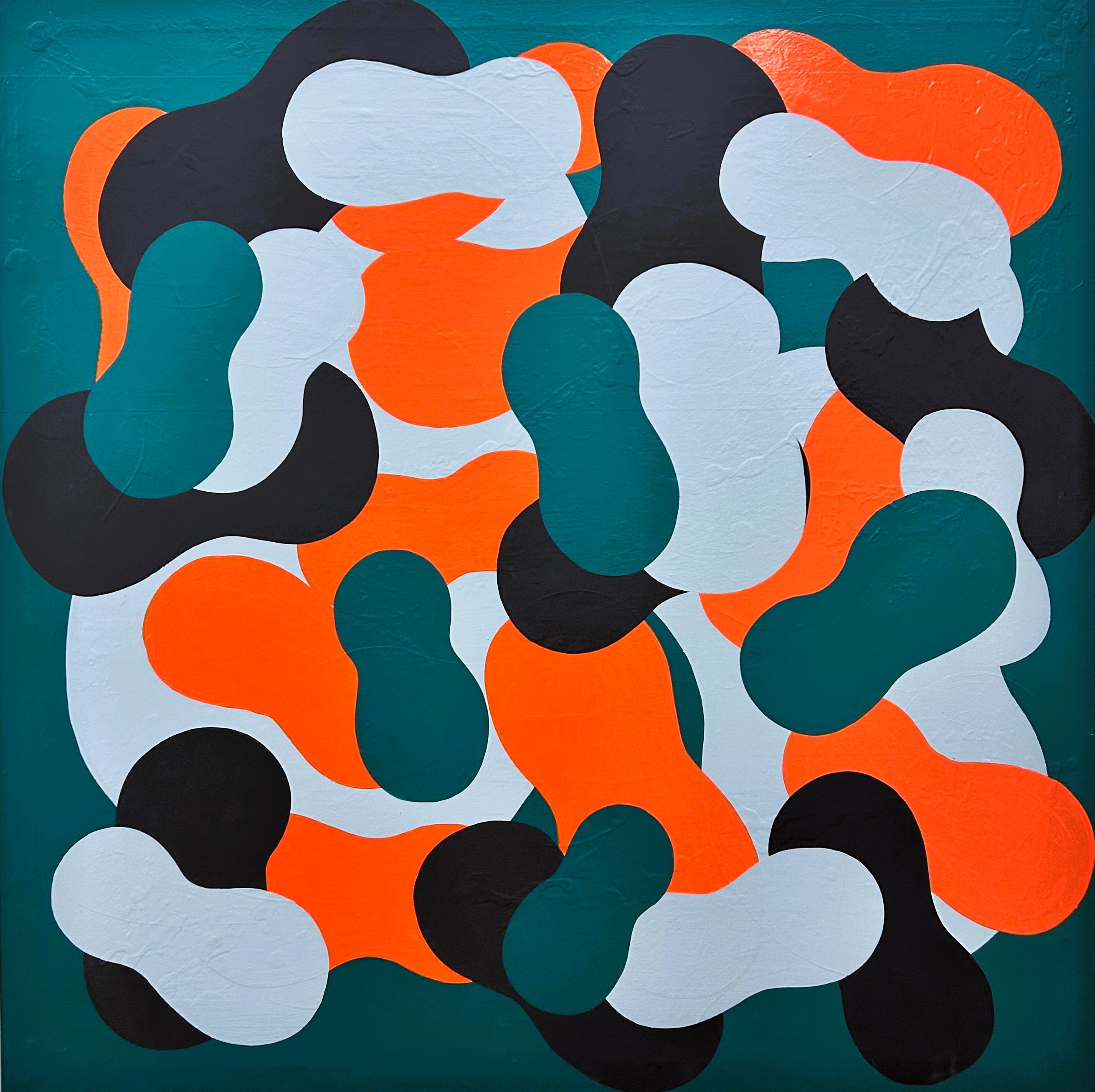 L’astratto percepito in forma globulare e molecolare, primitiva ed assemblata casualmente, ci riporta ad un’esperienza naïf. La superficie della tela si satura di una sorta di camouflage pop giocoso ed ipertrofico, rappresentazione stessa del cosmo e del suo intimo respiro.