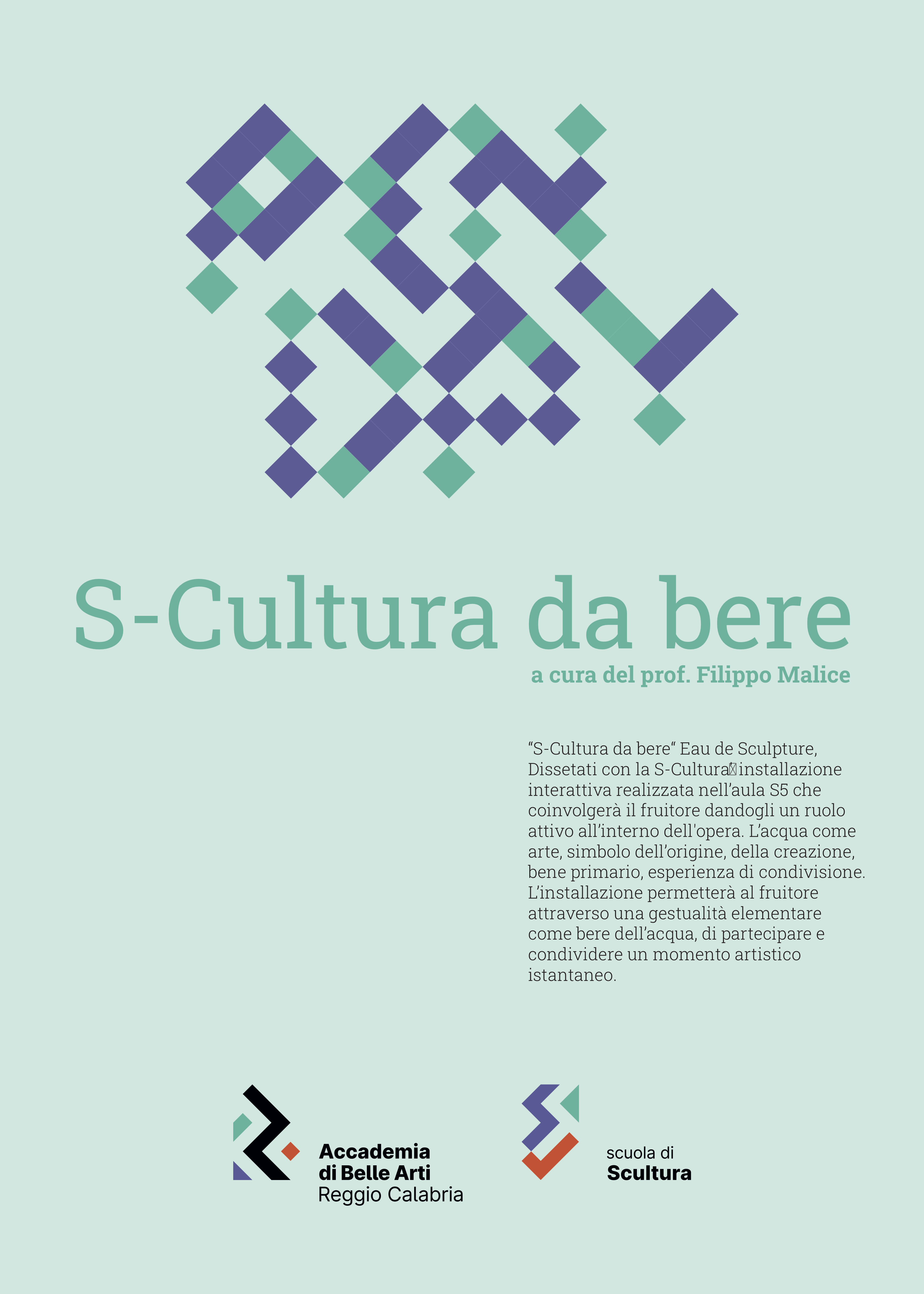 S-Cultura da bere “Eau de Sculpture, Dissetati con la S-Cultura” installazione interattiva realizzata nell’aula S5 che coinvolgerà il fruitore dandogli un ruolo attivo all’interno dell'opera. L’acqua come arte, simbolo dell’origine, della creazione, bene primario, esperienza di condivisione.