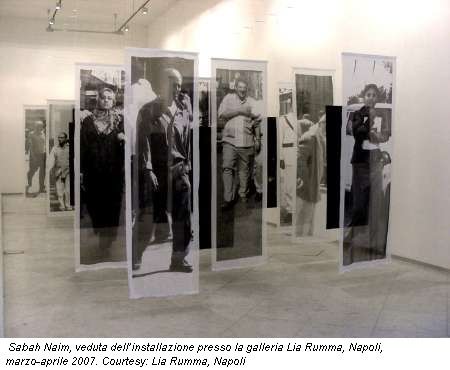 Il nuovo progetto dell’artista egiziana Sabah Naim esce dai confini delle pareti e occupa fisicamente lo spazio della galleria. Si tratta di un’installazione composta da leggerissime tele trasparenti sospese al soffitto, sulle quali sono stampate immagini singole a grandezza naturale della popolazione cairota. I teli obbligano l’osservatore a perdersi in un percorso labirintico che intende rievocare l’atmosfera caotica delle vie del Cairo, mentre la fragilità e la trasparenza del tessuto ci rimandano alla delicatezza espressiva e formale dell’arte araba. Le foto, scattate direttamente dall’artista o prelevate da giornali locali e vecchi album di famiglia, ci offrono una visione variegata della popolazione. Militari, anziani, ragazzini, donne sintetizzano la molteplice gamma culturale e sociale dei passanti. Sabah Naim vuole porre l’accento sulle relazioni tra gli individui e sulle difficili possibilità di contatto nella frenesia della vita contemporanea. La trasparenza dei tessuti crea uno stato di ambiguità tra realtà e finzione, obbliga ad un rapporto diretto con i soggetti e spinge a sentirsi parte integrante dell’opera. Il lavoro di Sabah Naim può essere considerato una sorta di reportage visivo che muove dalle sue vicende personali e familiari per spostarsi verso le origini culturali della sua terra. Le sue opere nascono da una combinazione tra immagini fotografiche, pittura e collage. Le immagini, quasi sempre in bianco e nero, sono spesso accostate ad elementi decorativi che rievocano nei motivi e nei colori il linearismo aniconico della tradizione artistica araba. In questo modo, al realismo dei personaggi, portatori del loro vissuto individuale, si contrappone l’astrazione del segno. In alcuni lavori questo contrasto tra astrazione e figurazione è accentuato dalla presenza di giornali o di frammenti cartacei che, arrotolati o ripiegati secondo rigorosi schemi geometrici, sono posti accanto alle foto e conferiscono al supporto una consistenza materica.