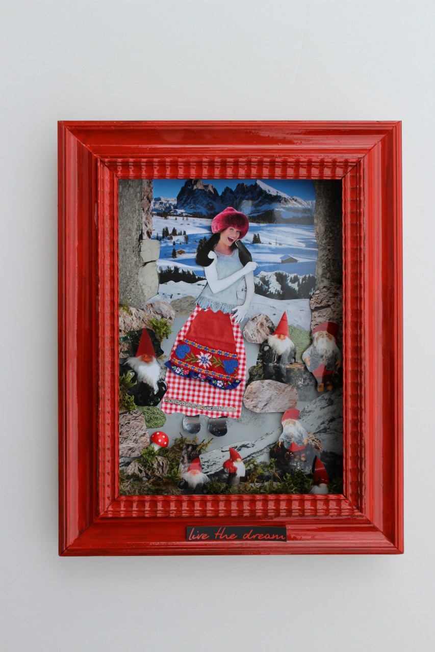 L'esito formale è quello di un kitsch intenzionalmente esasperato, propio come nella Wunderkammmer dove la via che porta ai monti, tra fiori variopinti e licheni da cui spuntano deliziosi funghetti rossi di amanita phalloides, ci viene indicata da una tradizionale mini- stazione in legno della Via Crucis, alla quale però, è stata sostituita l'immagine; ...salendo incrociamo poi lo sguardo sorridente di una fanciulla in costume tirolese, forse uscita da una qualche pubblicità ormai datata.
