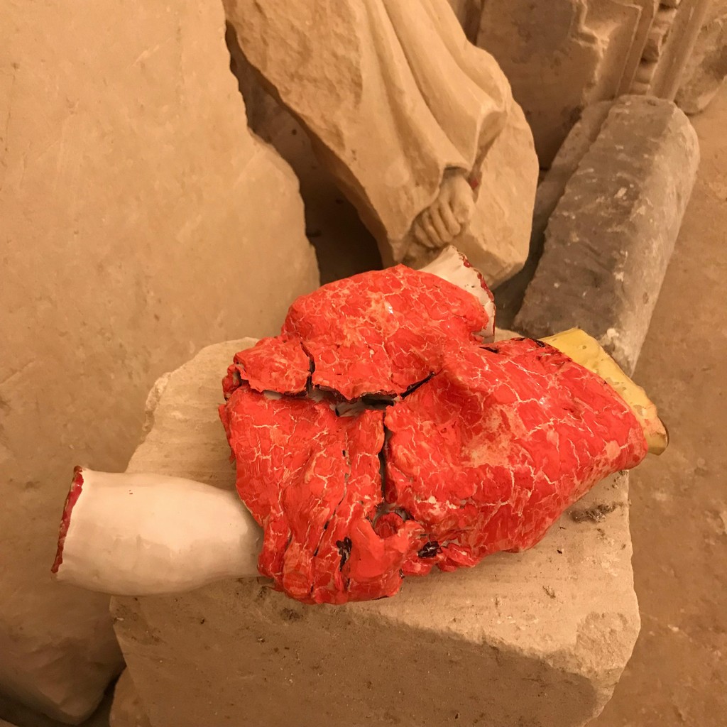 Le forme cave plasmate dall’artista dialogano con i corredi tombali e le testimonianze archeologiche degli antichi Peuceti e interagiscono in modo installativo con la collezione di gessi della vecchia Scuola comunale di disegno conservati nel museo. Caratterizzate da una volumetria morbida e da colori brillanti di gusto pop, le sculture di Sabino de Nichilo somigliano a strutture organiche e possono ricordare a chi li osserva cuori, fegati e stomaci, ma non rispondono ai canoni di un’anatomia ortodossa. “Organi da asporto”, “Carne frolla” e “Anus” – questi i nomi di alcune serie di opere esposte – sembrano ribellarsi al corpo che li potrebbe contenere e crescono liberamente, a loro piacimento, assecondando un impulso vitale alieno, inconsulto, barbaro. Sabino de Nichilo rende nobili gli scarti e le frattaglie e i processi digestivi ai quali allude evocano la società dei consumi nelle forme di una vanitas contemporanea, mescolando ironia e retaggi alchemici.