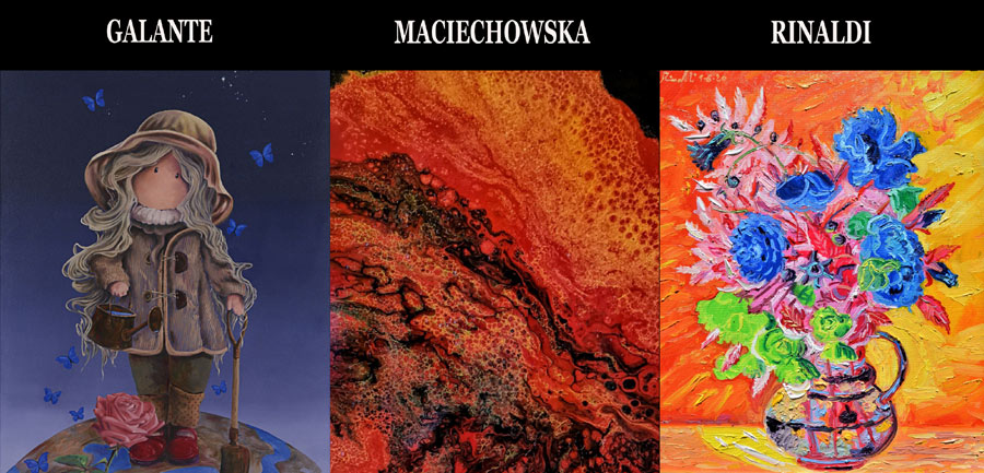 In mostra si potranno ammirare più di 45 lavori dei 3 artisti in esposizione, ognuno con un proprio stile, Galante con la rappresentazione del sogno, Maciechowska con la sua arte fluida e Rinaldi con il suo magnifico figurativo policromo.