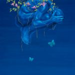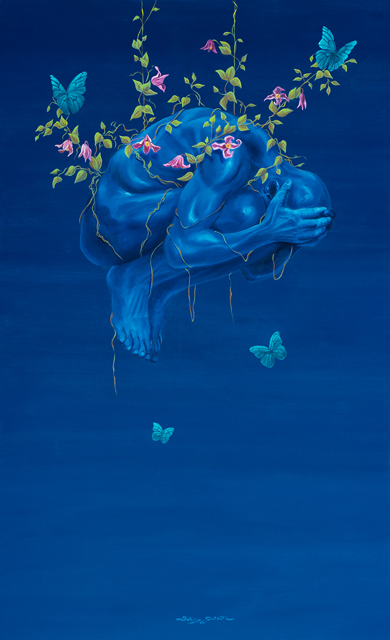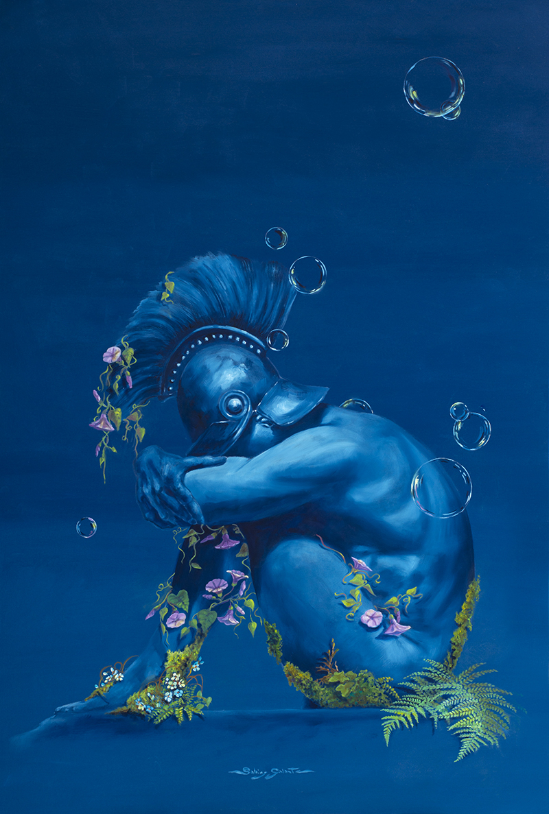 In “Vanitas” Galante ha ritrovato la bellezza nell’arte classica che lo ha ispirato con i suoi modelli iconici dalla primitiva purezza e delicato equilibrio. L’artista rappresenta delle sculture colte in attimi drammaticamente umani, costrette a un’apparente immobilità dal marmo con cui sono realizzate, crepate e spinte alla vita grazie alla natura rigogliosa. La pietra si fa cedevole e morbida, si piega sotto il peso dei pensieri e delle riflessioni che opprimono ogni uomo. L’obiettivo del pittore non è dunque solo quello di effettuare un semplice esercizio di copia della realtà che ci circonda, ma anche proporre una riflessione sullo scorrere del tempo: quello all’apparenza immobile del marmo, quello lento della crescita delle piante e quello fugace delle bolle di sapone o del fremito delle ali. Galante sceglie di utilizzare un altro fil rouge per riunire le sue opere ed è l’uso del blu, colore della meditazione, della profondità e dell’infinito, che aiuta lo spettatore a visualizzare una narrazione continua.