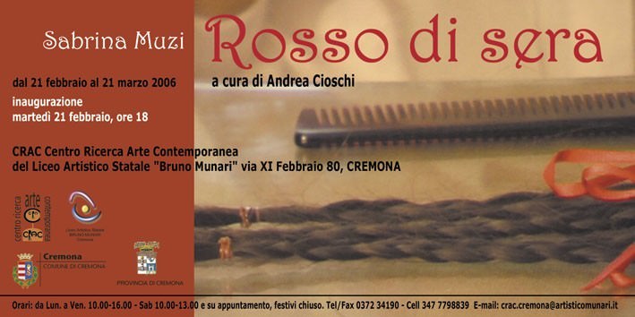 Rosso di sera è il titolo della sua ultima opera, composta da un video e da un’installazione strettamente connessi tra loro, presentati in una nuova soluzione espositiva appositamente ideata per gli spazi del CRAC – Centro Ricerca Arte Contemporanea del Liceo Artistico Statale “Bruno Munari” di Cremona. Rosso di sera è un progetto che raccoglie romanticismo e tensioni contemporanee, un gioco di seduzione tra la visione appassionata, il darsi totalmente all’altro per amore, e la dimensione della privazione, il perdersi per amore dell’altro. Intima e struggente, l’installazione Rosso di sera, racconta una dimensione dell’esistenza in cui il corpo diviene desiderio e restituisce la vertigine della mente, le palpitazioni cardiache, le tensioni epiteliali, la temperatura surriscaldata di un amore che si rivela come squarcio visionario e atemporale sul mistero.