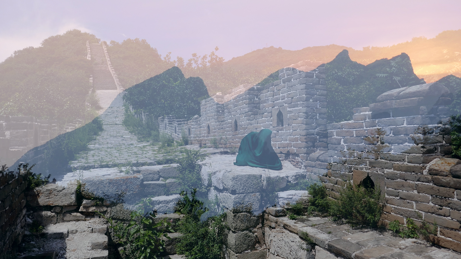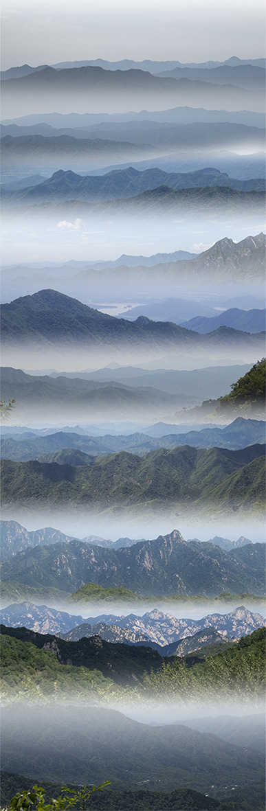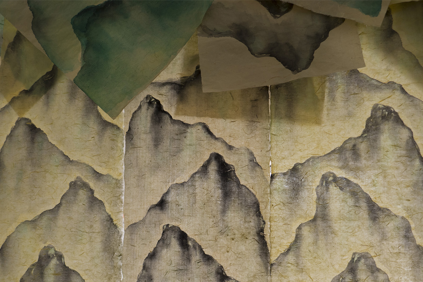 Shān è un’immagine icona che reiterata come un mantra si carica di forza simbolica divenendo emblema di un archetipo e testimone di un luogo e delle sue trasformazioni. A introdurre il lavoro, una nuova opera che sgorga dal camino della Sala delle Colombe e tende verso il centro della stanza. Al primo piano il nucleo principale del lavoro, l’installazione di carte sospese, le foto verticali montate su seta e le bacheche di disegni. Il progetto si concretizza in un'architettura del paesaggio e il video proiettato nella Sala dei Cani, in cui la magnifica decorazione sembra esaltarne la visione, la pone in relazione con una forma antropomorfa: due corpi entrano in risonanza, quello umano e quello della montagna, ponendo le basi per una nuova indagine percettiva sul paesaggio.