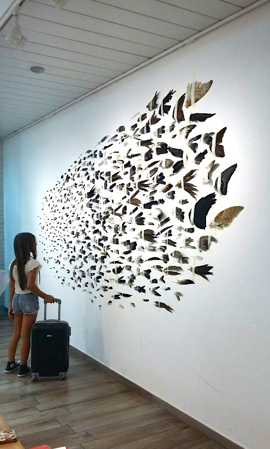 Coerente con il contesto aeroportuale dove, codici e voli, sono comuni denominatori di vita quotidiana, l’artista ci accompagna all’osservazione dell’opera in profondità, richiamando il volo interiore nel suo significato più immediato, proponendo uno status in movimento verso un nuovo obbiettivo