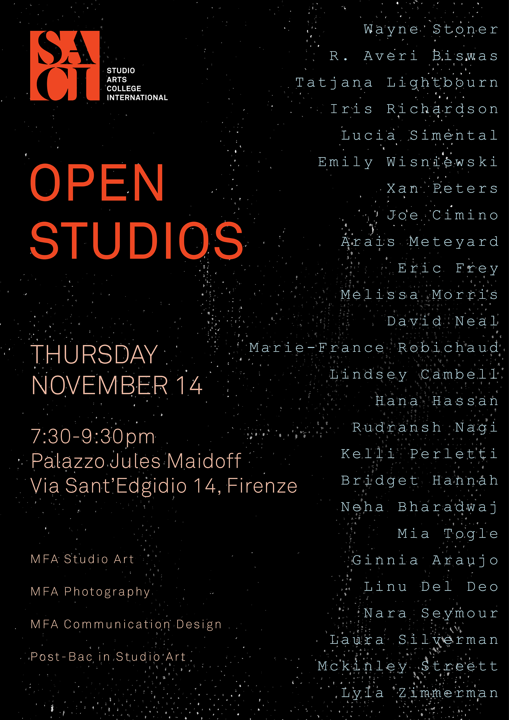 Open Studios è un’occasione unica per incontrare gli studenti dei programmi master di SACI in Studio Art, Communication Design, Photography e Post-Bac in Studio Art, esplorare i loro spazi di lavoro, vedere i lavori in corso ed offrire un prezioso feedback agli artisti.