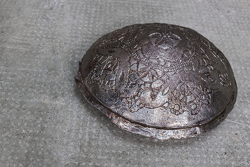 Così i merletti, il cui intreccio è una costruzione nel vuoto ben chiara nella mente e nelle mani di chi li crea, si irrigidiscono e si fondono con bronzo e metalli pesanti, diventando