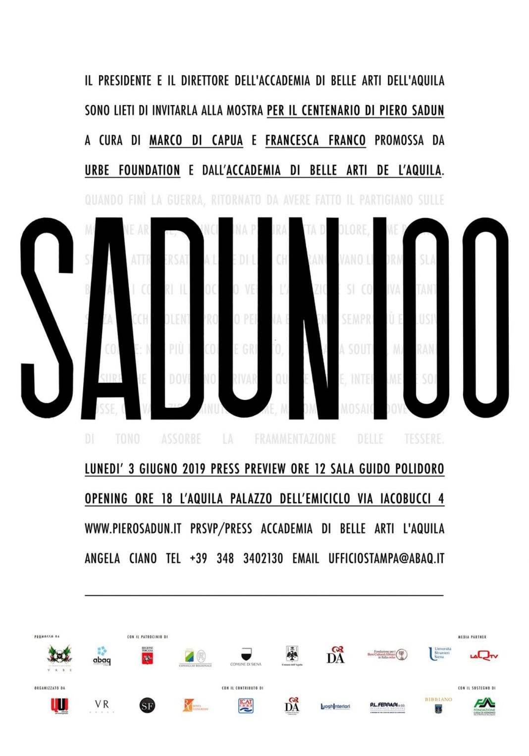 Da martedì 4 a giovedì 27 giugno Palazzo dell’Emiciclo, sede del Consiglio Regionale dell’Abruzzo, ospita l’antologica dedicata all’artista Piero Sadun (Siena 1919 – Roma, 1974). Organizzata dall’Accademia di Belle Arti dell’Aquila insieme con gli Eredi dell’artista, e il sostegno della Fondazione Carispaq, l’esposizione intende celebrare, nel centesimo anniversario della sua nascita, un protagonista dell’arte italiana del secondo Novecento, che nei primi anni Settanta ha contribuito in maniera significativa alla promozione della migliore cultura contemporanea nella città dell’Aquila. La mostra fa parte di un progetto espositivo in due tappe, che proseguirà in Palazzo Pubblico - Magazzini del Sale a Siena, dal 10 luglio all’ 8 settembre 2019.