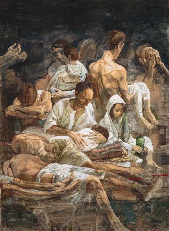 L’allestimento, realizzato nella chiesa e nelle sale dell’ex tribunale dell’Abbazia, vanta – oltre ad altre opere dell’artista – i suoi grandi teleri dedicati all’attuale tema delle migrazioni, teleri che fino al 30 novembre sono stati esposti nella Chiesa della Pietà, in Riva degli Schiavoni a Venezia. Il ciclo delle tele, dalle grandi dimensioni, realizzato con tecnica mista (dall’olio alla tempera, dal collage al disegno) raffigura la presa di posizione dell’artista contro ogni forma di guerra e contro la tragedia delle migrazioni e della fuga. Evidenzia Giandomenico Romanelli in «Naufragi», un capitolo del catalogo: «È davvero una costruzione mastodontica e terribile nella quale confluiscono tutte le sue esperienze e il suo dramma personale, il suo orrore della guerra e la pietà per le vittime, di qualsiasi lingua, colore, nazionalità ed etnia ma unite nella disperazione del futuro, nella inguaribile follia della guerra, delle morti, dei lutti, della violenza che l’uomo esercita sull’uomo».