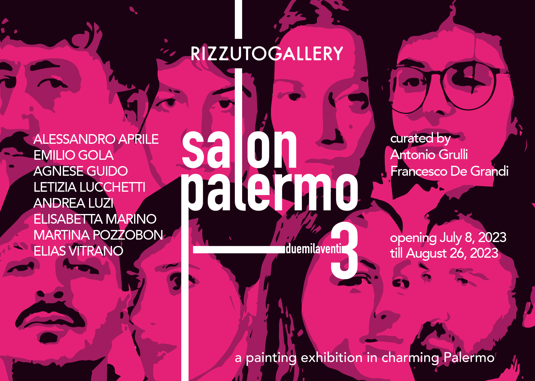 RizzutoGallery è lieta di presentare SALON PALERMO 3, collettiva incentrata sulla giovane pittura italiana, a cura di Antonio Grulli e Francesco De Grandi. La mostra sarà inaugurata sabato 8 luglio 2023 alle ore 19 e resterà visitabile fino al 2 settembre 2023, dal martedì al sabato, dalle 16 alle 20.