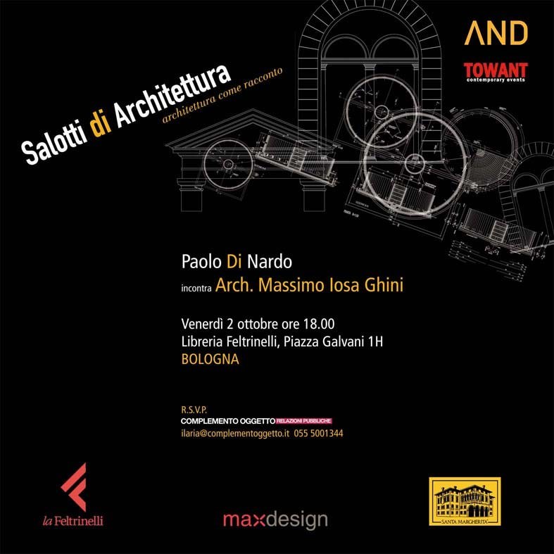 Promossi dalla rivista di architettura AND e dal suo direttore, arch. Paolo Di Nardo, “Salotti di Architettura” sono un nuovo modo di “raccontare l’architettura” attraverso vari incontri con alcuni dei più noti architetti italiani. Il “primo” Salotto si terrà venerdì 2 ottobre, alle ore 18.00, presso la Libreria Feltrinelli di Piazza Galvani a Bologna, con l’arch. MASSIMO IOSA GHINI.