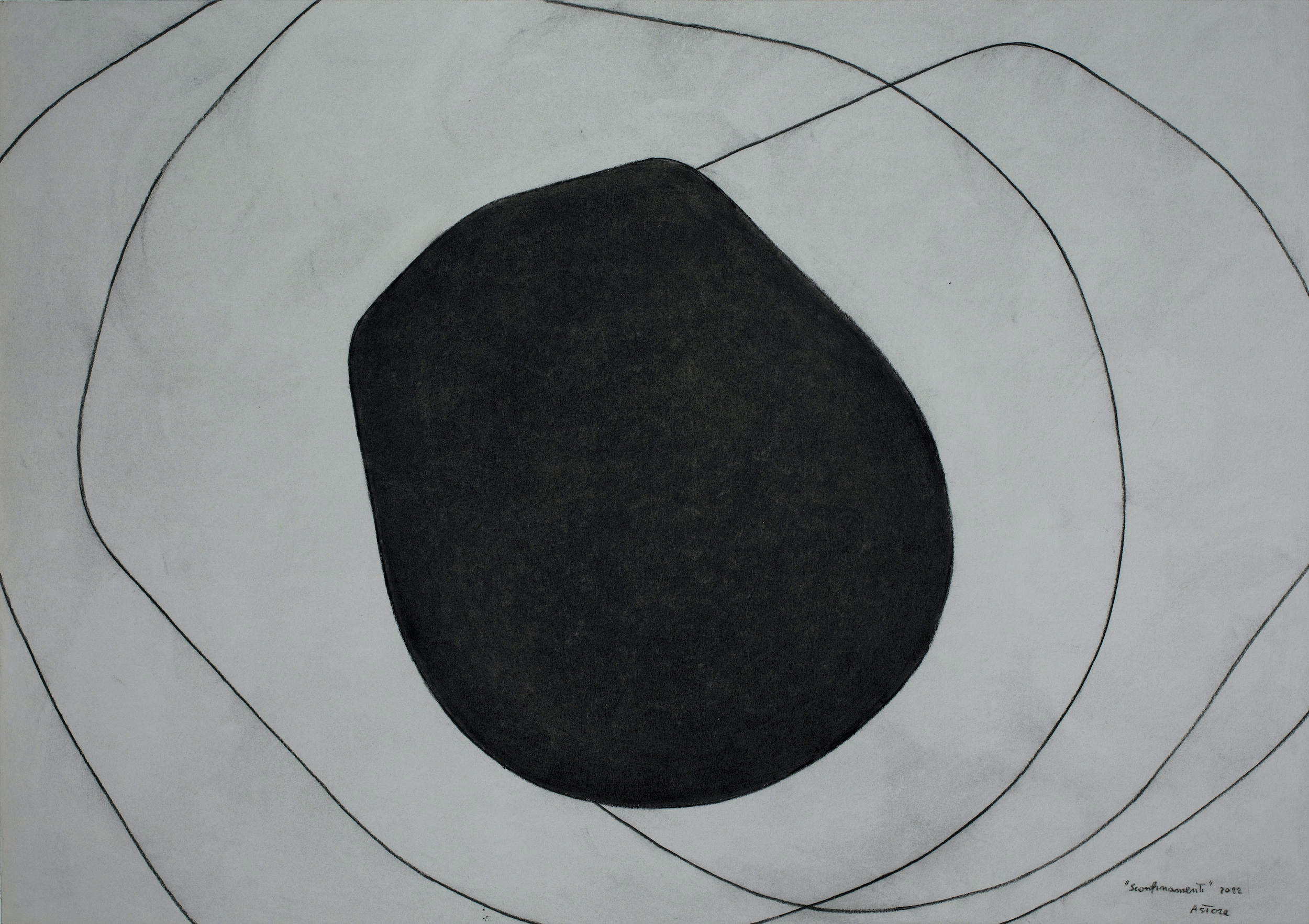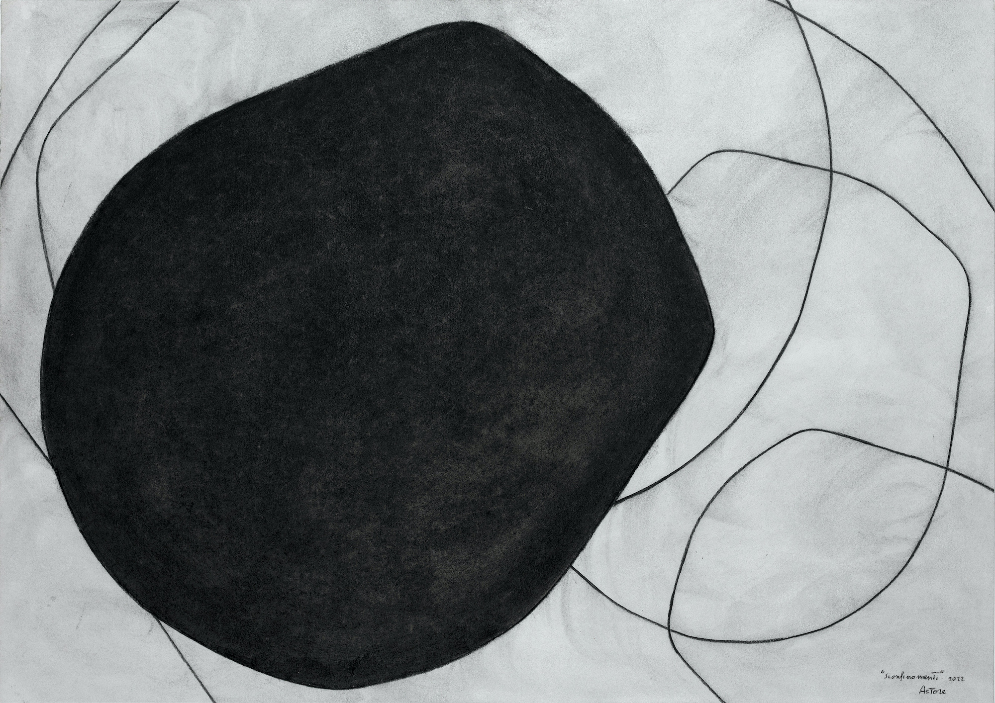 Nella cosiddetta “sala del camino” l’artista continua a stupirci. Su una grande base bianca, come fosse un foglio da disegno, è posizionato un gruppo di nuove sculture, questa volta in una scala più ridotta rispetto al lavoro precedente. Sono realizzate in bronzo, materiale utilizzato da Astore per la prima volta. Il ricorso ad un materiale tanto classico quanto riconducibile al linguaggio della scultura è qui impiegato in virtù delle sue potenzialità plastiche e cromatiche. Rispetto ai lavori degli ultimi anni, le forme si sono evolute, allargando il vuoto al loro interno. C’è in atto un “alleggerimento della materia”. Nella medesima stanza sono poi esposti Sconfinamenti, nuovi disegni a matita e olio su carta che, fin dal titolo, partecipano in assoluta sintonia al progetto espositivo. In essi l’iconologia ormai riconoscibile della “calotta” viene sviluppata dall’artista con assoluta libertà segnica. Attraverso il disegno Astore sperimenta le infinite possibilità della Forma e riscrive una personalissima idea di spazio-tempo. Le linee si intersecano, si coagulano, si dilatano fino a saturare lo spazio bidimensionale del foglio in un ideale movimento che dalla superficie conduce alle profondità della materia.