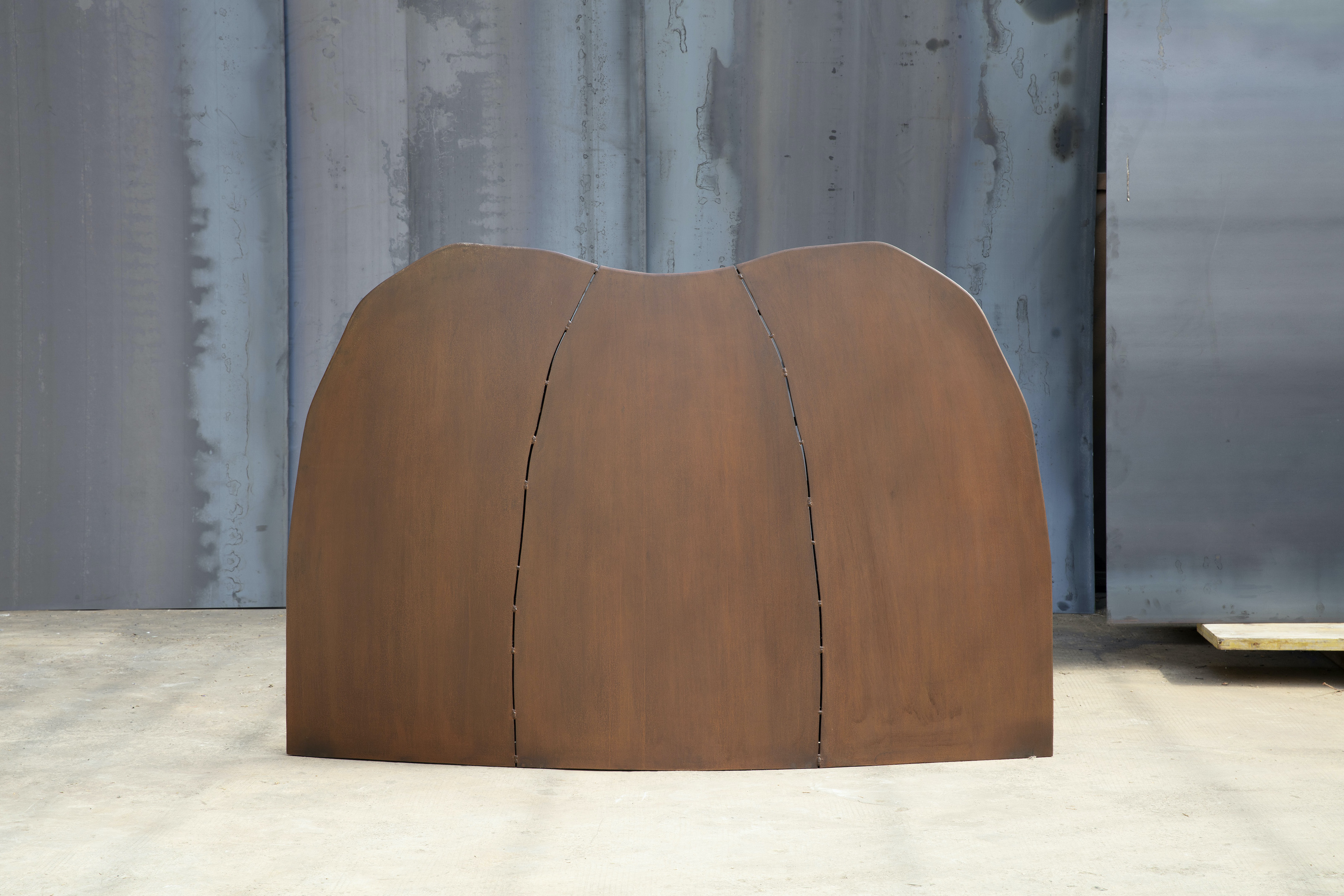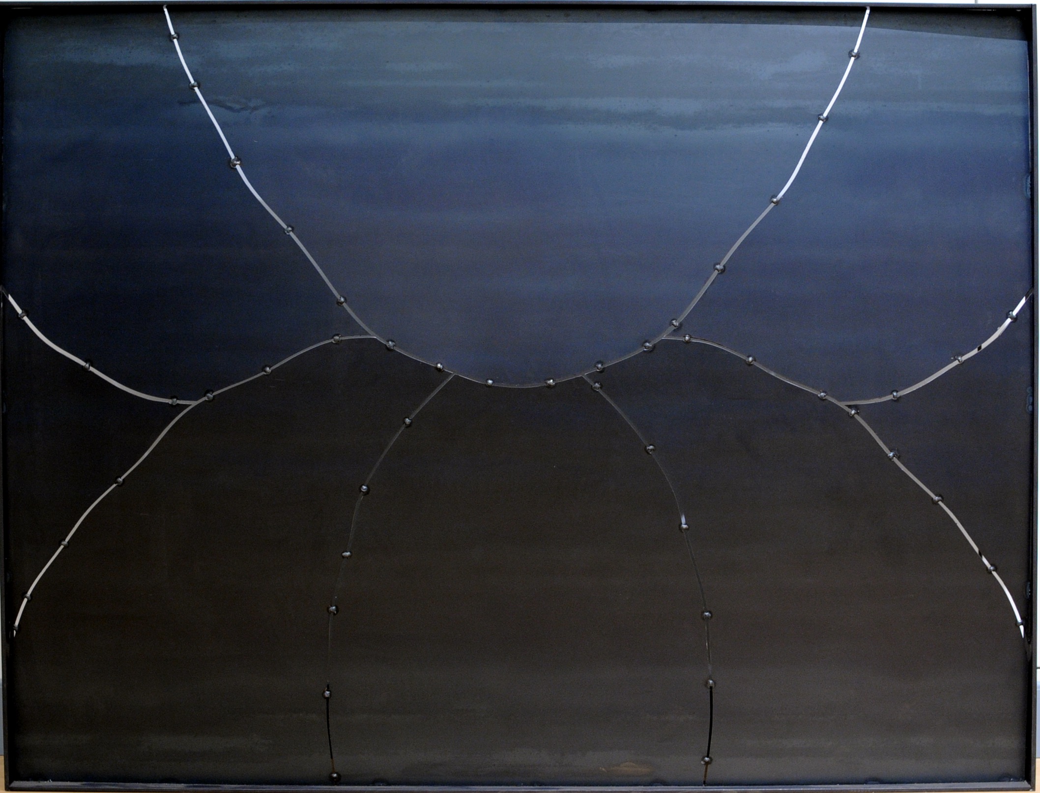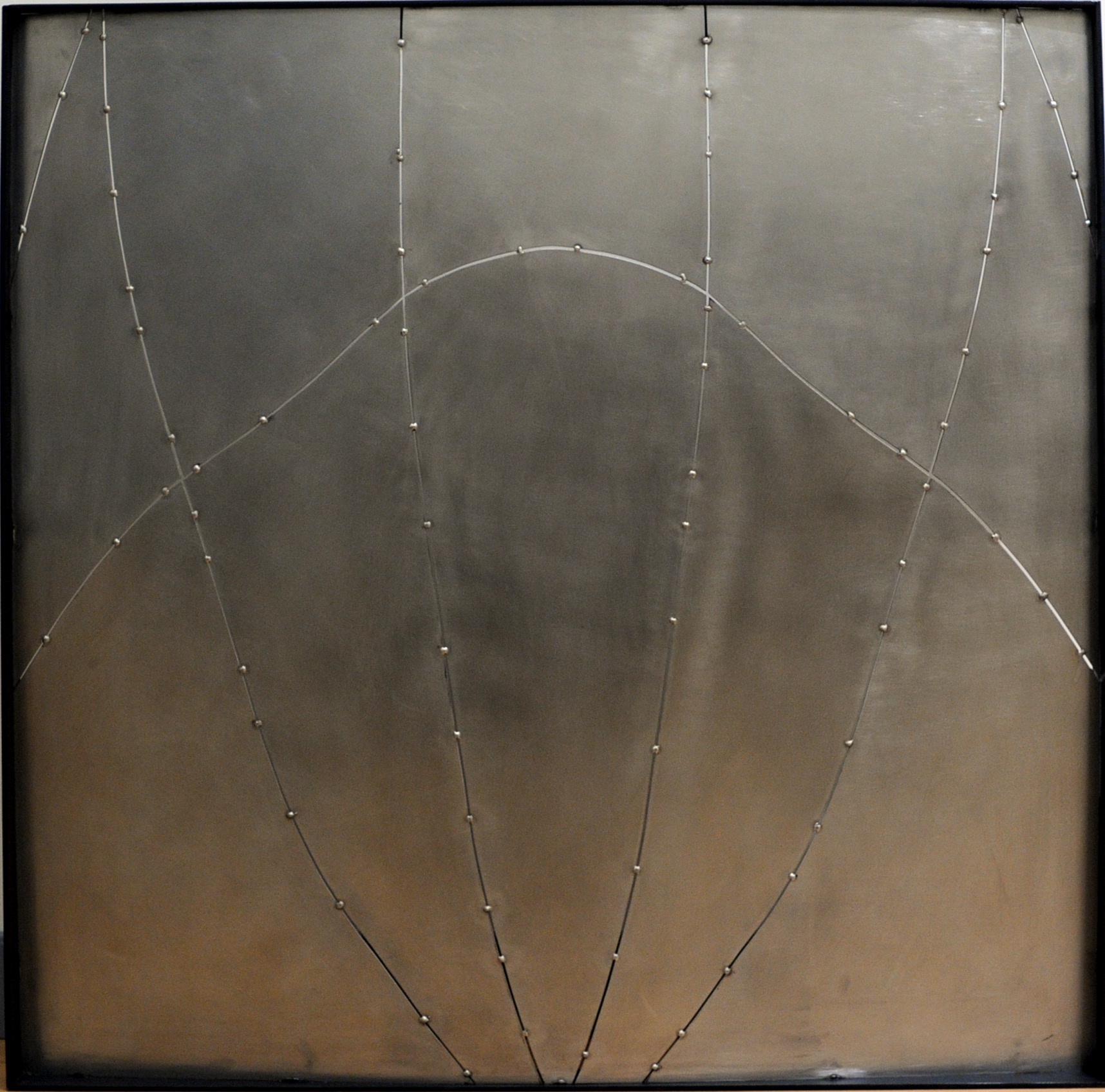 All’ingresso ci accoglie Grande calotta, un’opera storica del 1988 in acciaio inox saldato e satinato. La scultura, a livello dimensionale, mette volutamente alla prova la parete che la ospita, dilatandosi quasi fino a toccarne i confini laterali.