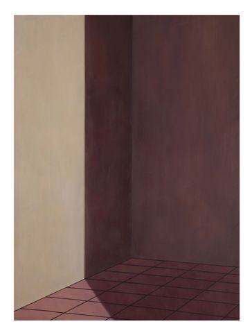 sue alte pareti e del pavimento, questo spazio vuoto e spoglio si carica di una sospesa e silenziosa tensione metafisica, determinata dalla nitida precisione geometrica delle superfici e degli angoli e da una luminosità fredda e straniante che arriva dall'apertura di una porta e che con un netto taglio obliquo da vita a una zona d'ombra o penombra.