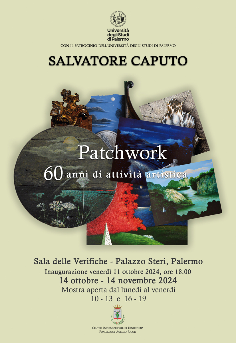 Venerdì 11 ottobre 2024 alle ore 18.00 verrà inaugurata presso la Sala delle Verifiche di Palazzo Steri (Piazza Marina, Palermo) con il patrocinio dell’Università degli Studi di Palermo e del Centro Internazionale di Etnostoria – Fondazione Aurelio Rigoli, la mostra di Salvatore Caputo “Patchwork. 60 anni di attività artistica”, a cura di Danilo Maniscalco. La mostra sarà visitabile dal 14 ottobre al 14 novembre, tutti giorni esclusi sabato, domenica e festivi dalle 10 alle 13 e dalle 16 alle 19.