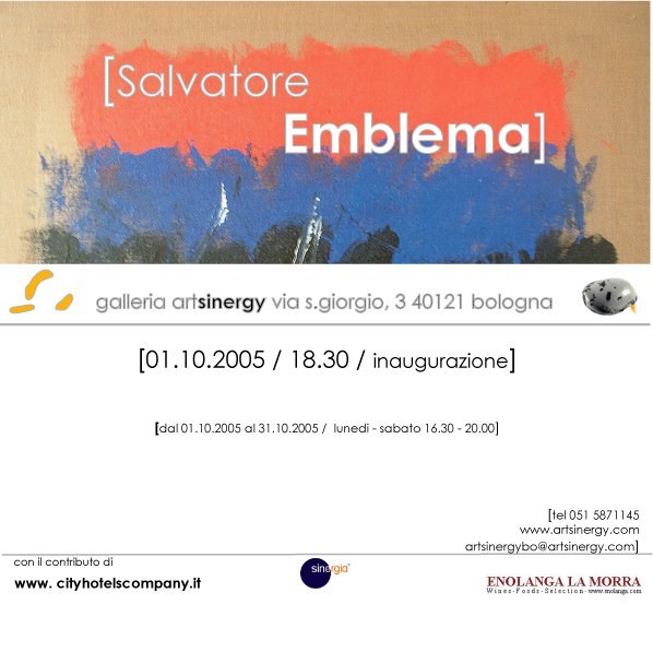 Con la mostra di Salvatore Emblema inaugura la nuova sede bolognese di Artsinergy, struttura aperta e articolata che si fonda su un rapporto di sinergia e scambio culturale tra nuove gallerie di arte contemporanea.