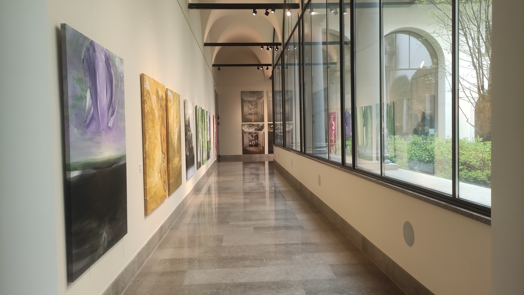 Le quindici opere su tela e su teloni PVC riciclati provenienti dalle pubblicità dismesse, dominate soprattutto dal verde e dal viola sacrale, rappresentano invece la parte tangibile della mostra. Titoli come Università Immateriale di estrema Sapienza invitano a riprendere possesso della nostra immaginazione, senza la quale, sempre più, l’uomo si allinea al pensiero comune perdendo la propria indipendenza e umanità.
