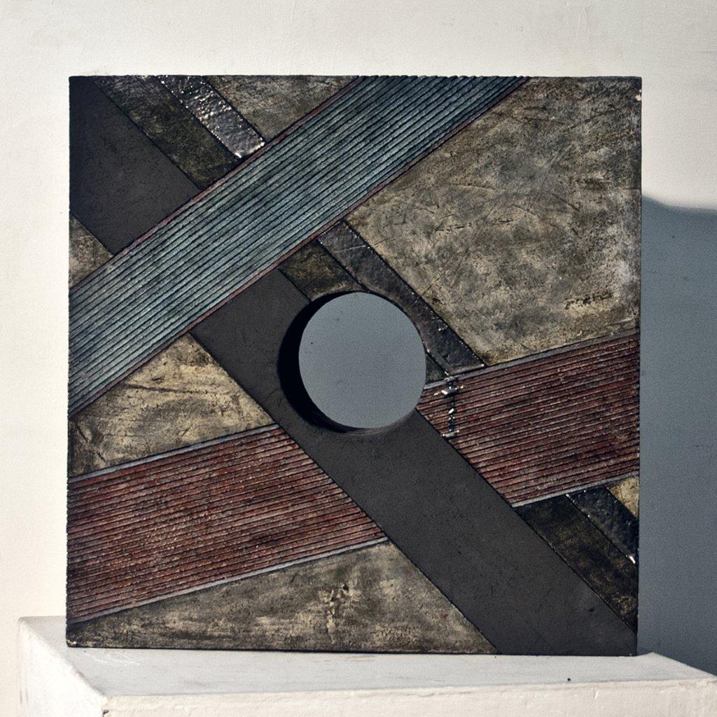 Laddove Giunta disegna spazi tridimensionali attraversabili con le linee sghembe dei suoi tondelli di ferro scuro, sapientemente equilibrati, per contrasto, da forme geometriche piene che ne tirano il peso visivo, Zampieri dal canto suo offre il pieno della materia a lui consueta, la ceramica, alleggerendone la consistenza con gli strati vetrosi dei vari passaggi di cottura, conferendole quel movimento geometrico delle forme che lo avvicina al lavoro di Giunta. Ma mentre il movimento delle forme pure di Giunta assume nella lettura un carattere squisitamente narrativo, in Zampieri invece il piacere della lavorazione della materia, sia essa ceramica o cartoncino, si sposa all’intenzione icastica e simbolica delle figure e degli andamenti elaborati.