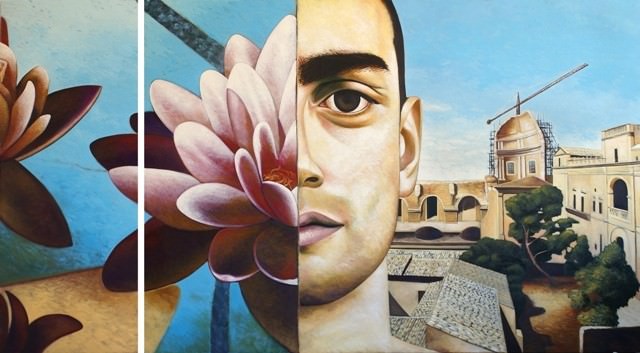 Una visione mistica, dunque, che ha luogo nel suo paesaggio natio, la Sicilia, in cui i personaggi sono quasi sempre sospesi e immersi nel paesaggio che le comprende come parte integrante, avvolti nella spirituale ricerca di se stessi. Qui “L’occhio, il più spirituale degli organi umani, sembra trapassare e annullare nella sua imperscrutabile profondità il rapporto spazio/tempo che fin dall’inizio appare come uno degli enigmi più affascinanti e importanti per Salvatore Santoddì” (D. Amoroso, dal testo in catalogo). Una profonda sensibilità dell’artista che emerge osservando le sue tele intrise di introspezione: in esse si riconosce una stratificazione di culture, a partire da quella greca e normanna, che tanto prosperò nelle terre siciliane, fino a toccare i principi fondamentali delle religioni orientali, in particolar modo quella buddista. Un mix perfetto di spiritualità e paesaggio, in cui attraverso i segni del passato (chiese madri, cappelle, cattedrali che rinascono in cantieri con gru) si possono leggere i semi del futuro. Così corpi femminili navigano sospesi in contemplazione, lungo vaste distese di verde, sui cimeli delle vecchie culture, alla ricerca del proprio cammino, come fanno gli uccelli migratori che si spostano in luoghi molto lontani, nell’illusione di approdare in nuovi lidi e cancellare la propria dolorosa condizione del vivere.