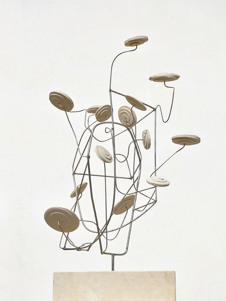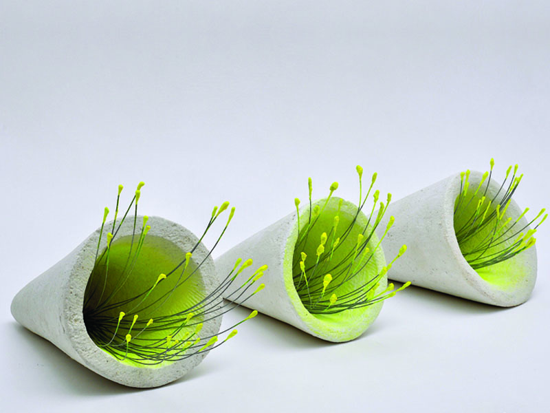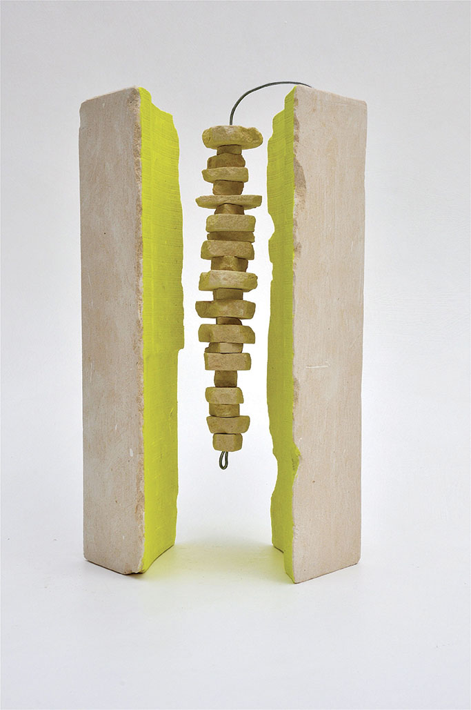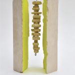 E così il segno di questa anomalia diventa l’elemento che distingue i lavori di Salvatore Sava, che dipinge alcune parti delle sue opere con tonalità accesissime, color giallo fluo. Opere scultoree realizzate con materiali tipici del suo territorio di provenienza, il Salento, che danno vita a un inventario di forme ispirate all’ambiente e alla natura. Equilibri rigorosi, forme primarie e composizioni essenziali, dove pieni e vuoti si alternano armonicamente e i contrasti tra materie leggere e pesanti si bilanciano nelle proporzioni e nelle misure. Evidenziando alcuni elementi con il colore.