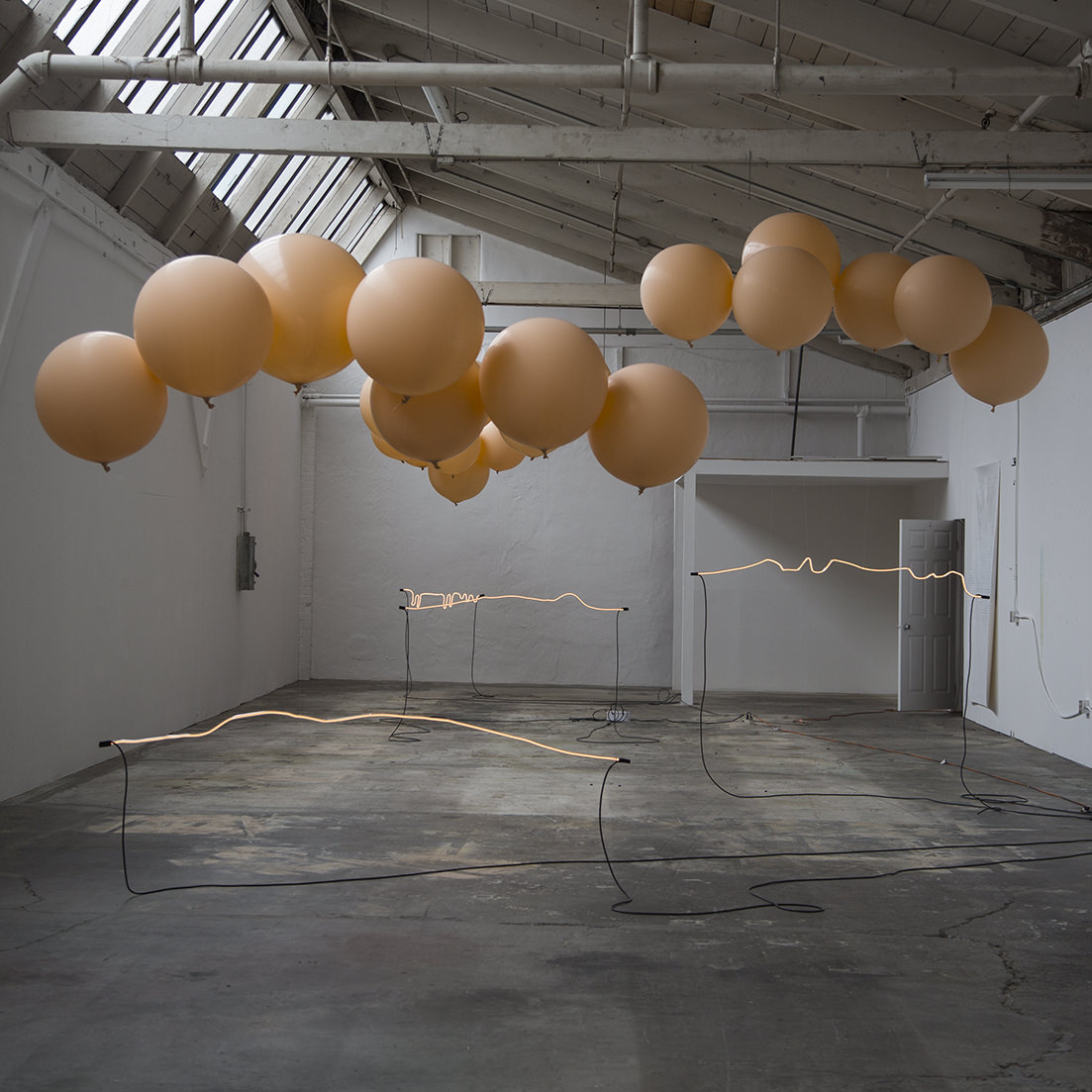 Le opere con l’elio nascono nel tentativo di ampliare l’idea di shifter, non solo come funziona nel tempo ma nel mondo fisico al di là del linguaggio. La luce incandescente è carica di elio e i palloncini sospesi sono riempiti di elio: attivo in due stati fisici particolarmente drammatici, l’elemento naturale non cambia. L’elettricità mostra il colore dell’elio e i palloncini gli danno forma: l’immagine è rappresentativa ma anche piuttosto astratta e non so quale dei due incida di più nel dare all’opera la sua gravità. La forma dei vetri dei neon traccia i profili della mia famiglia, dei miei amici, di me stesso e dei miei cani. Queste opere rappresentano il microcosmo dell’invecchiamento; sorrette all’inizio, piene di energia e vita, caleranno nel tempo in perfetto stato restando alla fine sgonfie sul pavimento. Ciò che è stato continuerà a bruciare e i palloncini rimarranno a indicare la memoria di ciò che fu.”