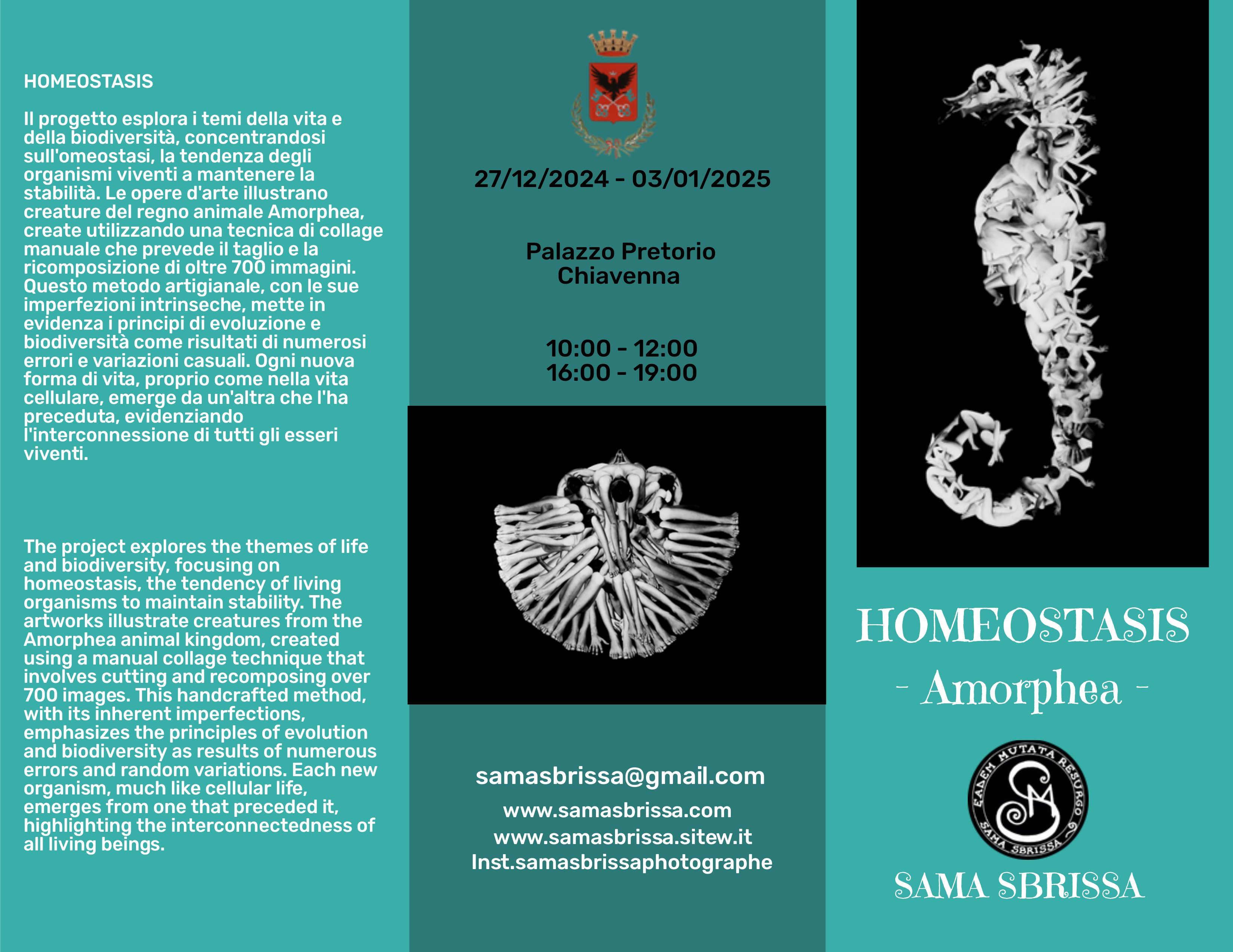Questo progetto analizza la vita e la biodiversità, focalizzandosi sull’omeostasi, ovvero la capacità degli organismi di mantenere la stabilità. Le opere presentano creature del regno animale Amorphea, realizzate attraverso collages manuali di oltre 700 immagini realizzate con fotografie di nudi.