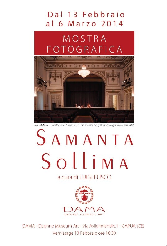 Il Dama – Daphne Museum Art, spazio espositivo collocato all'interno del MAC - Museo d'Arte Contemporanea di Capua (CE), ospiterà, dal 13 febbraio al 6 marzo 2014, la personale di Samanta Sollima “Vita sulle Punte”, a cura di Luigi Fusco. Il vernissage si terrà giovedì 13 febbraio alle ore 18.30. Samanta, figlia del noto regista Sergio Sollima, racconta la vita quotidiana e le fantasie di cinque ballerine classiche in un percorso intimo e delicato, con le licenze poetiche di un balletto. Le protagoniste interpretano se stesse sul palcoscenico e oltre, sospese tra la danza e l’arte della vita di tutti i giorni: tra le pareti domestiche, nel mondo del lavoro, nei sogni e nell’amore per l’arte. Una dimensione quotidiana che ben si evince dalle parole di Luigi Fusco <> Il progetto fotografico è stato realizzato a Firenze, in collaborazione con la coreografa Ilaria Tinacci, “Chiare Fresche Dolci Group” e alcune allieve della Scuola di Danza Salvetti. Tra gli ambienti dove le protagoniste muovono i loro passi, figurano: il Museo Casa Buonarroti, il Teatro Della Pergola e Museo Della Pergola, il Mercato Centrale di Sant’Ambrogio, le Officine grafiche STIAV nel Comune di Calenzano, la Sartoria Teatrale Fiorentina di Massimo Poli e la Scuola di Danza Salvetti. Una foto del progetto è stata finalista nella categoria arte e cultura al Sony World Photography Awards presso World Photo di Londra, 2012. Dopo la personale di Roma e di Firenze, “Vita sulle punte” approda al Dama, che arricchisce l’elenco delle prestigiose location che hanno già ospitato il lavoro di Samanta Sollima, artista che interpreta la fotografia come strumento imprescindibile per raccontare il mondo del palcoscenico e dello spettacolo cui è profondamente legata sin dagli inizi della sua carriera. “Vita sulle punte” rappresenta, dunque, un altro importante tassello nell’attività di valorizzazione delle più diverse forme d’arte contemporanea avviata dal Daphne Museum Art. Un percorso che ha portato il Dama a divenire uno spazio culturale collettivo, punto di riferimento per artisti e amanti dell'arte. Un luogo di esposizione e di condivisione, ma soprattutto di divulgazione della cultura dell’arte e del lavoro tanto di artisti affermati quanto di giovani emergenti.