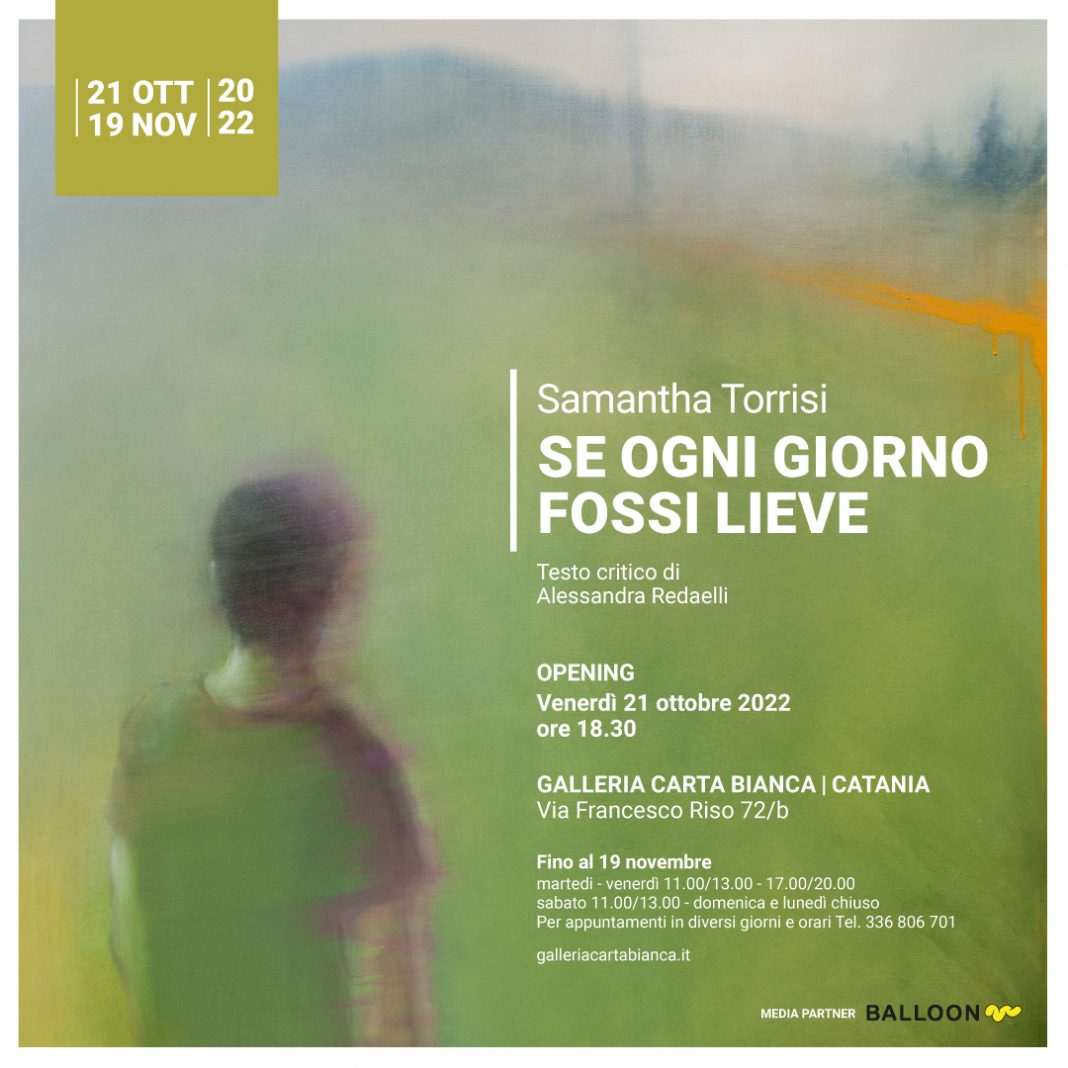 Verrà inaugurata venerdì 21 ottobre 2022 alle ore 18.30, negli spazi della Galleria Carta Bianca di Francesco Rovella “Se ogni giorno fossi lieve” la nuova mostra personale di Samantha Torrisi. Un progetto con una ventina di opere recenti quasi tutte inedite, in cui l’artista catanese indaga alcune
